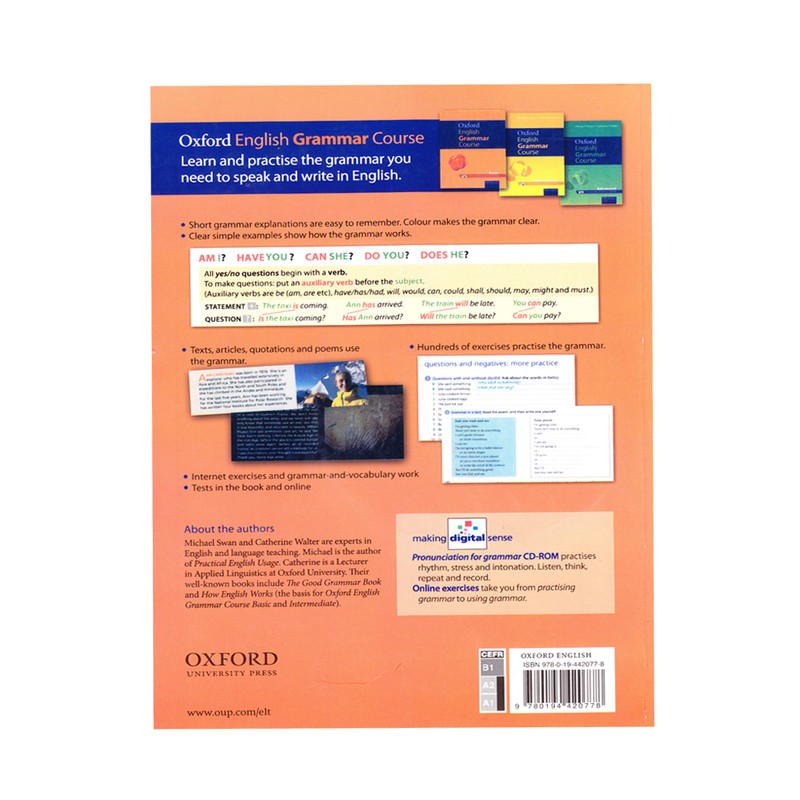 مجموعه آموزشی Oxford English grammar course یک دوره کامل آموزش گرامر انگلیسی است. در این مجموعه همه گرامر انگلیسی به صورت کامل در سه سطح مبتدی ، متوسط و پیشرفته آموزش داده می شود. مجموعه حاضر گرامر انگلیسی British را آموزش می دهد اما زبان آموزان انگلیسی آمریکایی و استرالیایی نیز می توانند از مجموعه استفاده نمایند. مجموعه برای آموزش، افزایش دانش عمومی گرامر و تقویت گرامر، در سطوح پیشرفته زبان آموزان و داوطلبان آزمون های PET و KET مناسب است. ارائه مثال های ساده و قابل فهم، توضیحات گرامری انگلیسی کوتاه، کاربرد رنگ های مختلف در آموزش، تمرینات اضافه گرامر انگلیسی همراه با پاسخ و نیز ارائه نرم افزار جهت آموزش ارکان تلفظ نظیر استرس و ریتم، زیر و بمی صدا از ویژگی های بارز آموزش گرامر انگلیسی آکسفورد Oxford English Grammar Course می باشد. مجموعه محصول انتشارات آکسفورد و مولف آن نویسنده کتاب موفق Practical English Usage می باشد.
