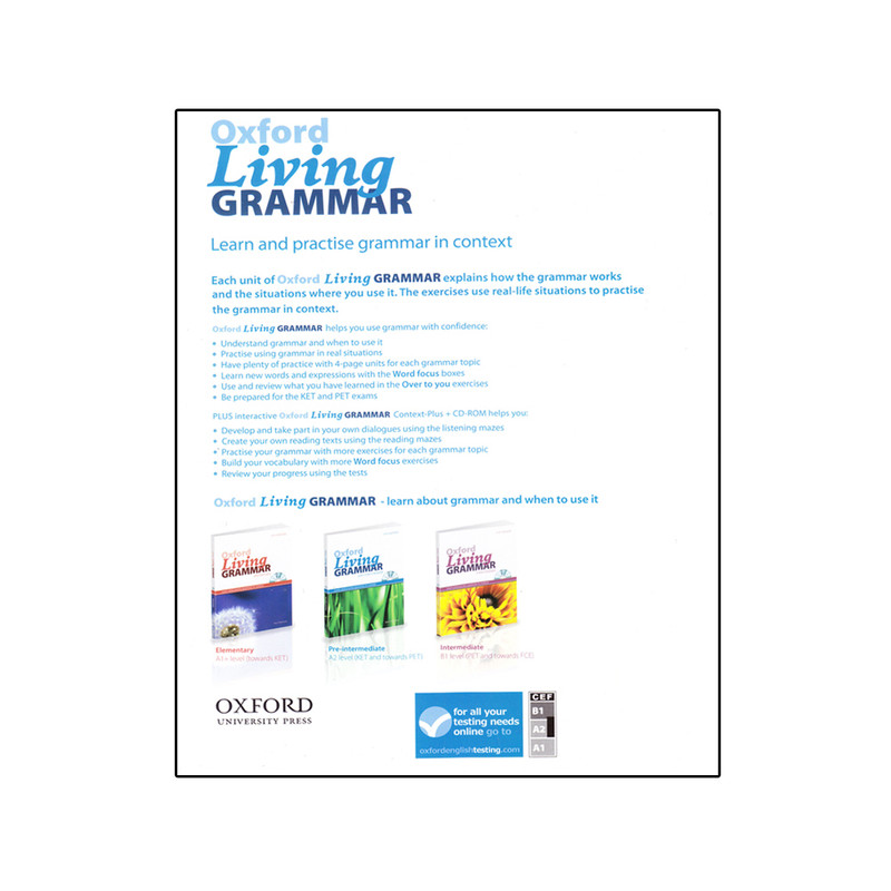 سری 4تایی کتابهای Oxford living grammar برای سطوح مبتدی، پیش از متوسط، متوسط و بالاتر از متوسط نگارش شده است و به دانش آموزان کمک میکند تا گرامر را بصورت صحیح و با اعتماد به نفس در موقعیتهای روزمره استفاده کنند. روندی که Oxford living grammar برای تفهیم نکات گرامری استفاده میکند، روندی آرام و عملی است.