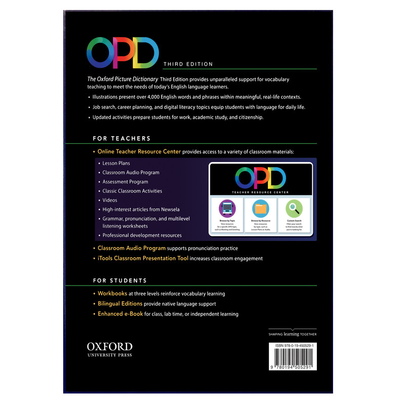 سومین ویرایش از مجموعه پرفروش Oxford Picture Dictionary که با روشی منحصر بفرد لغات مختلفی را به زبانآموزان میآموزد. این دیکشنری یکی از ابزارهای آموزشی مناسب برای یادگیری زبان انگلیسی به شمار میآید. تقویت درک واژگان، گسترش دامنهی لغات، آشنایی با نکات و تقویت چهار مهارت اصلی (Listening, Speaking, Reading, Writing)در زبان انگلیسی از ویژگیهای مهم این کتاب محسوب میشود. این فرهنگ لغت تصویری، بیش از 4000 واژهی ضروری زبان انگلیسی را با تصاویر زیبا و در صفحات رنگی و به صورت تکزبانه (انگلیسی) ارائه کرده است. دوازده فصل تدوین شده در این فرهنگ به موضوعاتی نظیر کارهای روزمره، مردم، خانه، غذا ، سرگرمی و ... پرداخته است. در هر فصل، ابتدا کلمههای مورد نظر و متناسب با عنوان فصل بصورت تصویری نمایش داده شده و پس از آن داستانی کوتاه آورده شده که کلمات تدریسشدهی آن فصل در آن داستان گنجانده شده است. در انتهای هر فصل نیز متنی آورده شده که لغات جدیدی از همان گروه در آن به چشم میخورد. از ویژگیهای برجستهی این کتاب داشتن تمرینهای متنوع است که سطح یادگیری زبان آموز را میآزماید.