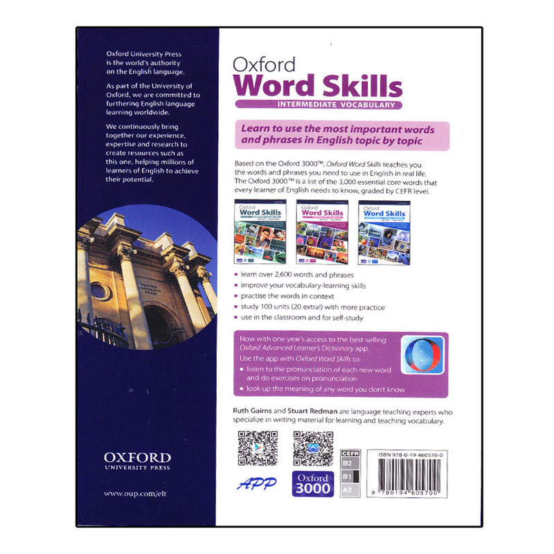 میتوان گفت مجموعه کتابهای Oxford Word Skills یکی از جامعترین و غنیترین کتابهای آموزش زبان انگلیسی در سراسر دنیاست که با تمرکز بر گسترش دایره لغات دانشجویان، به ارتقاء مهارتهای مختلف آنها کمک شایانی میکند و با استفاده از تکنیکهای بهروز، دانش زبان آنها را دگرگون میسازد. این مجموعه کتاب در سه سطح مختلف به چاپ رسیده و این کتاب در سطح Intermediate است که زبانآموزان میتوانند با توجه به سطح زبان، کتاب مناسب خود را انتخاب نمایند. مجموعه حال حاضر، بهروزترین کتابهای این مجموعه و آخرین ویرایش آن است که در سراسر دنیا به عنوان یک منبع غنی، مورد استفاده قرار میگیرد. در ویرایش جدید این کتاب ، ارائه کوتاه ، واضح و فرصت های فراوان برای تمرین ، به زبان آموزان اطمینان می دهد که از واژگان جدید استفاده کنند. ۱۰۰ موضوع در هر سطح از کتاب وجود دارد که این به این معنی است که طیف گسترده ای از موضوعات و موقعیت های روزمره را پوشش می دهند. اپلیکیشن Oxford Advanced Learner’s Dictionary یا برنامه OALD ، تلفظ و اطلاعات بیشتری در مورد معنی و کاربرد کلمات در قالب جمله و مثال را ارائه می دهد و همچنین معانی مختلف هر واژه را در اختیار زبان آموزان قرار میدهد. بارکد دانلود نرم افزار تکمیلی بر روی جلد انتهای کتاب برای سیستم عامل های اندروید و IOS موجود هست .