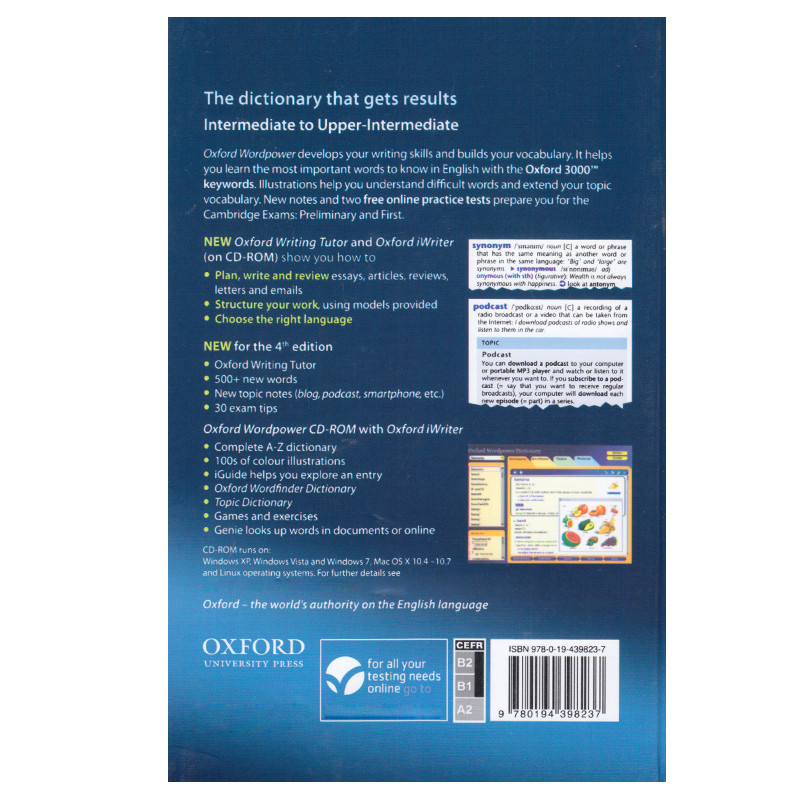 کتاب Oxford Wordpower Dictionary در این هدف به زبان آموزان کمک میکند تا مهارت نوشتاری خود را همراه با عبارات و جملات کاربردی در نگارش پاراگراف و مقاله نویسی،توسعه و گسترش دهند،و همچنین دایره واژگان خود را به سطح بالایی که بتوانند نیازهای اولیه ی نگارش خود را برطرف کنند طراحی و تنظیم شده است. -این فرهنگ،دو سویه است که علاوه بر ویرایش انگلیسی به انگلیسی و انگلیسی به فارسی،دارای ترجمه ی انگلیسی به عربی نیز است.این کتاب دارای 3000 لغت میباشد. -تمام ابزار های لازمه برای گسترش و ساخت واژگان که به مهارت نوشتن و واژه شناسی که زبان آموزان برای قبولی در آزمونها و تقویت زبان عمومیشان نیاز دارند فراهم شده است. -در این فرهنگ،معادل های مناسب عربی در مقابل هر مَدخل انگلیسی نوشته شده است. -تلفظ کامل هر واژه با علائم بین المللی فونتیک (IPA) مقابل هر واژه ذکر شده است. -این کتاب دارای 100 ها اشکال رنگی همراه با کلمه های مرتبط با آنها نیز میباشد و دارای 30 نکته ی ضروری برای آزمون ها است. -این فرهنگ لغت،موضوع بندی شده است و نقش دستوری هر کلمه ذکر شده است .-در این کتاب اصول علم آواشناسی(PHONETICS) به زبان بسیار ساده توضیح داده شده است. -این فرهنگ لغت دارای نکات گرامری نیز میباشد.
