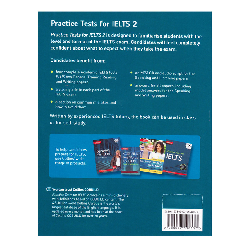نویسندگان در این کتاب،هر چهار مهارت را به طور کامل همراه با جزئیات متنوع و مرتبط به موضوع برای داوطلبان آیلتس،گردآوری کرده اند و که نکات و توصیه های ضروری در نگارش و استراتژی های پرکاربرد در مهارت خواندن و درک مطلب را کاملأ جامع توضیح داده اند.تست های شبیه سازی و گردآوری شده برای آزمون آکادمیکو جنرال ،بسیار مفید و کاربردی هستند و آنها با استانداردهای آزمون جهانی آیلتس طراحی و تنظیم شده اند. کتاب Collins Practice Tests for IELTS 2از آن نوع کتابهای تست زنی و تمرینی است که هم در کلاس درس و هم به صورت خودخوان،داوطلبان میتوانند از آن استفاده کنند.