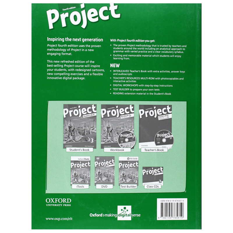 مجموعه Project (ويرايش چهارم) با تصاوير جديد، تمرينها و بسته ديجيتالي جديد در 5 دوره براي کودکان 10 تا 15 سال ارائه ميشود. این مجموعه شامل 5 کتاب با سطوح مختلف بوده و هر کتاب شامل 6 درس میباشد. این کتاب مشوقی عالی برای یادگیری زبان انگلیسی از طریق ارائه محتواهای بهروز و جدید میباشد. این کتاب با فراهم آوردن متون جذاب، موضوعات بحث برانگیز و فعالیتهای منحصربفرد در تمام سطوح دانشآموزان را به یادگیری زبان علاقهمند میسازد.