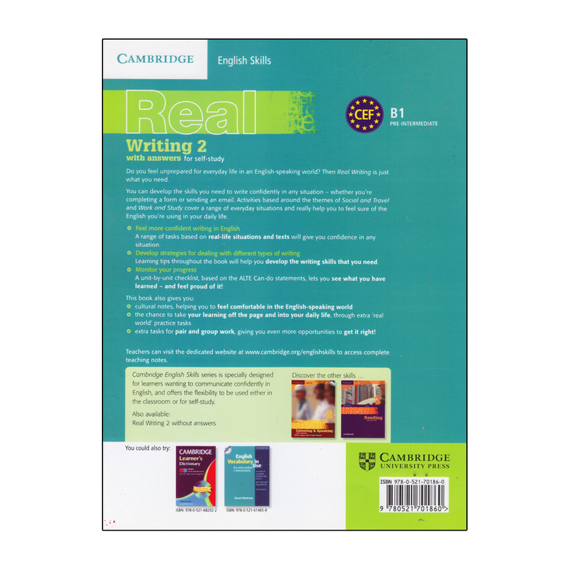 مجموعه Real Writing یک مجموعه 4 سطحی مناسب برای زبان آموزان جوان و بزرگ سال است که در سطوح ابتدایی تا پیشرفته هستند و می خواهند مهارت های نوشتاری خود را تقویت کنند. این کتاب به مهارت نوشتن پرداخته است و از ويژگي اين کتاب ارائه مسائلي که در زندگي روزمره کاربرد دارد مانند در خانه، در محل کار، مسافرت، مطالعه، معاشرت و ... نمونه مثال و تمرين، تمرين هاي تعاملي به صورت گروهي يا دو نفره و آشنايي با افراد بومي از ديگر خصوصيات اين مجموعه است.