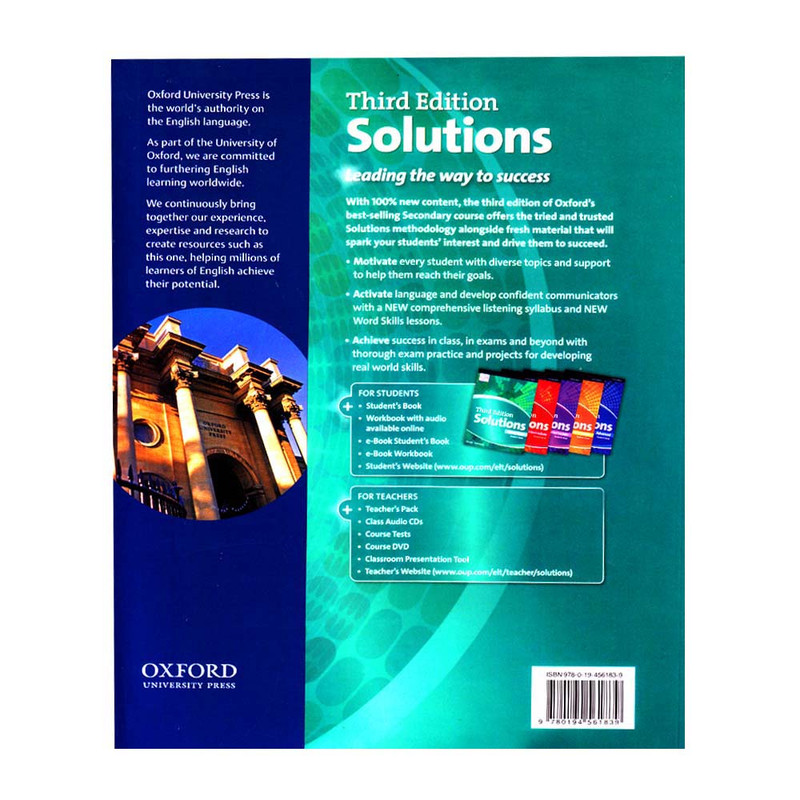 مجموعه آموزش زبان انگلیسی Solutions ویرایش سوم یکی از بهترین مجموعه های آموزش زبان انگلیسی است که برای گروه نوجوانان تنظیم شده است. شبیه ویرایش های قبلی ویرایش سوم حاوی محتواهای جذاب و دوست داشتنی است. تمرکز ویرایش سوم این مجموعه بر مهارت شنیداری زبان آموزان و دانش واژگان می باشد. یک منبع جامع و بسیار مهم متمرکز بر آموزش اساسی واژگان، دستور زبان، خواندن، صحبت کردن و نوشتن، همه و همه با بهره گیری از محتوای 100٪ به روز در زمینه مهارت شنیداری و مهارت های واژگانی که به توسعه و تقویت مهارت های ارتباطی و آزمون می پردازد. نه فصل در کتاب گنجانده شده که هر فصل نیز شامل هشت درس می شود. این کتاب به زبان اموزان روش ها، راهبردها و مهارت های آزمون که برای دستیابی به موفقیت لازم دارند را در چارچوبی دقیق و جامع فراهم می کند. ویژگی های ویرایش سوم: • تمرین های اضافی دستور زبان برای زبان آموزانی که از لحاظ دستور زبان نیاز به تمرین بیشتری دارند. • نه درس جذاب و مهیج درباره مطالعات فرهنگی و واژگان مربوطه و جدید. • تمرکز محوری بر آمادگی برای آزمون های خارجی. • آموزش مهارت های مهم قرن بیست و یکم برای تقویت تفکر انتقادی و همکاری گروهی دانش آموزان. • برگه های امتحانی آماده در زمینه ادبیات که طیف وسیعی از ژانرها و دوره های ادبی را پوشش می دهد. • درس های شنیداری و مهارت های ویژه برای کمک به تقویت مهارت ارتباطی و اعتماد به نفس. • منابع اضافی، از جمله دوره های آموزشی برای مربیان امتحان و تمرین اضافی صحبت کردن. • تمرکز ویژه ای بر تمرینات کاربردی گرامر و مهارت های واژگان، خواندن، نوشتن، گوش دادن و صحبت کردن. • محتوای غنی از رسانه های معروف با موضوعات و متون جالب و جذاب.