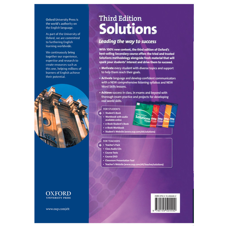 مجموعه آموزش زبان انگلیسی Solutions ویرایش سوم یکی از بهترین مجموعههای آموزش زبان انگلیسی است که برای گروه نوجوانان تنظیم شده است. شبیه ویرایشهای قبلی ویرایش سوم حاوی محتواهای جذاب و دوستداشتنی است. تمرکز ویرایش سوم این مجموعه بر مهارت شنیداری زبانآموزان و دانشواژگان میباشد. یک منبع جامع و بسیار مهم متمرکز بر آموزش اساسی واژگان، دستور زبان، خواندن، صحبت کردن و نوشتن، همه و همه با بهرهگیری از محتوای 100٪ به روز در زمینه مهارت شنیداری و مهارتهای واژگانی که به توسعه و تقویت مهارتهای ارتباطی و آزمون میپردازد. نه فصل در کتاب گنجانده شده که هر فصل نیز شامل هشت درس میشود. این کتاب به زبانآموزان روشها، راهبردها و مهارتهای آزمون که برای دستیابی به موفقیت لازم دارند را در چارچوبی دقیق و جامع فراهم میکند.