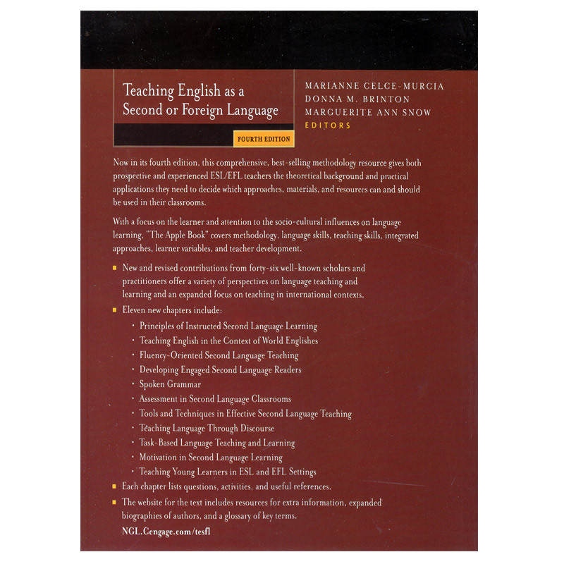جدیدترین ویرایش کتاب پرفروش Teaching English as a Second or Foreign Language در 23 ژانویه ی سال 2013 منتشر شد. کتاب پیش رو، پس زمینه ای نظری و برنامه ای عملی را در اختیار معلمان باتجربه و آینده نگر قرار می دهد. این کتاب منبع در درجه ی اول به عنوان یک کتاب درسی برای دوره های TESL/TEFL طراحی شده است، اما به عنوان مرجع و راهنمایی سودمند برای تمرین معلمان محسوب می شود. در تدوین این کتاب، پس زمینه ی نظ...