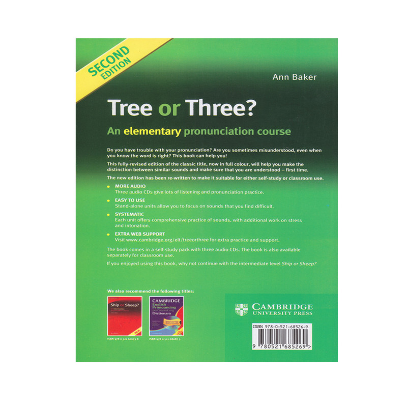 کتاب Tree or Three یک کتاب تمرین آواشناسی بسیار لذت بخش است که به زبان آموزان سطح مبتدی تلفظ صحیح کلمات را از همان سطح مبتدی آموزش میدهد؛ تمام صفحات این کتاب،تمام رنگی هستند، و موضوعات کاربردی آن بسیار روان آموزش داده شده است. این کتاب میتواند هم به صورت خودخوان و هم در کلاس درس مورداستفاده قرارگیرد. آموزش استرس و فرازو نشیب در جملات پرسشی و خبری از ویژگی های بارز این کتاب است.این کتاب شامل 47 درس است،که هر درس یک علائم آوایی را تدریس میکند.بخشی از آن علائم آوایی مصوت ها و بخشی دیگر صامت ها را آموزش میدهد. این کتاب،شامل تمارین فوق العاده و بی نظیری است که به کمک آنها،میتوان تمام تلفظ صحیح کلمات را به راحتی دانست و آنها را در خواندن و نوشتن استفاده کرد.