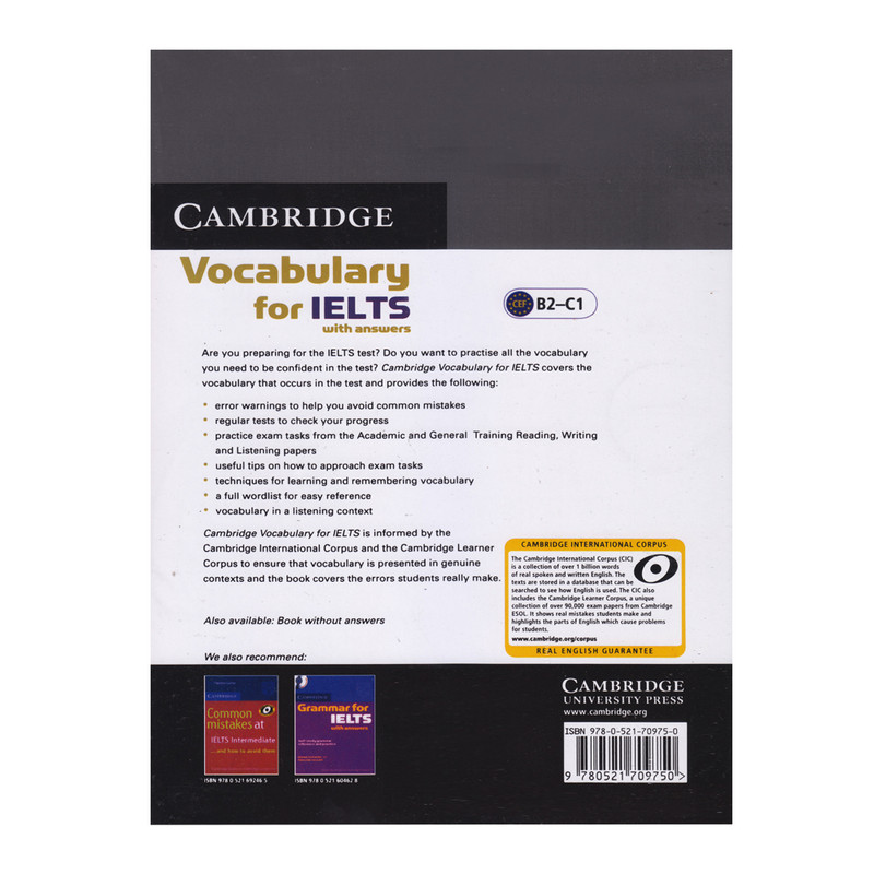 کتاب "Cambridge Vocabulary For IELTS" شامل واژگانی است که در آزمون آیلتس به کار میرود. این کتاب از طریق شنیدن و خواندن متنهای مرتبط با آزمون آیلتس واژههای جدید و مهم را به مخاطبان میآموزد. یادگیری واژه در متن باعث میشود کلمهها به سرعت وارد حافظه شوند. این کتاب با ارائهی آزمونهای منظم نیاز زبانآموزان این آزمون را برطرف میسازد و شامل تمرینهایی از تستهای Reading و Writing و Listening آزمونهای عمومی و آکادمیک آیلتس است. راهنمایی و توصیف واژگان نیز از ویژگیهای کتاب حاضر است. در صفحات ابتدای کتاب نیز نحوهی برگزاری آزمون آیلتس، زمانبندی و نمرهدهی آن معرفی شده است. علاوه بر لوح فشرده صوتی، پاسخنامه کامل با جزییات نیز در پایان کتاب ارائه شده است.