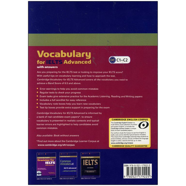 کتاب Cambridge Vocabulary for IELTS Advanced بانکی از آزمون های اصلی آیلتس را به همراه نکات هایلایت شده و خطاهای رایج داوطبین در اختیار شما قرار داده تا شما نیز مرتکب این خطاها نشده و نمره به مراتب بهتری را در آزمون آیلتس کسب کنید و از نتیجه خود خوشنود باشید. این کتاب از رفرنس های ویژه آمادگی آزمون آیلتس است که استفاده از آن را به شدت توصیه می کنیم.