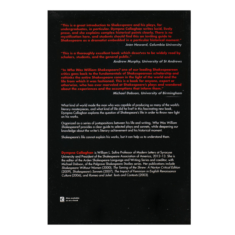 کتاب Who Was William Shakespeare اثر Dympna Callaghan انتشارات الوندپویان مطالبی در حوزه زندگی و حوادث دوران شکسپیر، شاعر و بزرگ ترین نمایشنامه نویس انگلیسی در اختیار خواننده قرار داده و اطلاعات او را در زمینه آثار شکسپیر بالا می برد. کتاب Who Was William Shakespeare شرح مفصلی از زندگی شخصی و نمایشنامه¬های معروف شکسپیر را در اختیار مخاطبین علاقمند قرار داده و با دیدی موشکافانه به 24 نمایش نامه برتر و غزلیات او می نگرد. این مجموعه به 4 مقولۀ مهم در زندگی شکسپیر مانند آموزش، مذهب، موقعیت اجتماعی و تئاتر می پردازد. در این مجموعه تئاتر به عنوان یک نهاد و محیط ادبی در لندن معرفی می شود.