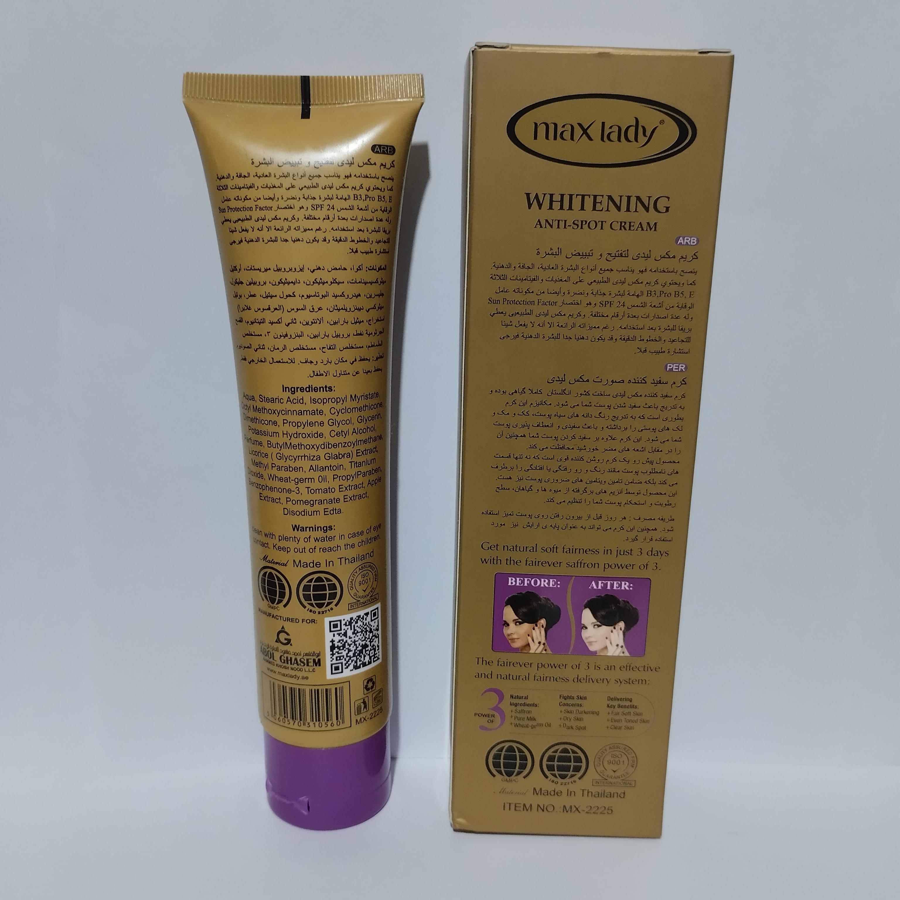 کرم مکس لیدی (Max Lady Whitening Anti-Spot Cream) یک کرم روشنکنندهٔ قدرتمند با ترکیب ویژهای از عصارههای گیاهی و میوهای شامل شیرینبیان، گوجهفرنگی، سیب، انار و روغن جوانهگندم است که بهصورت تدریجی باعث افزایش شفافیت، یکنواختی و سفیدی طبیعی پوست میشود. این کرم با فرمولاسیون غنی خود، به آرامی رنگدانههای تیره، لکهای پوستی، ککومک و تیرگیهای مزاحم را کاهش داده و پوستی روشنتر، نرمتر و با طراوت ایجاد میکند. وجود مواد مغذی و ویتامینهای ضروری به همراه فیلتر محافظتی SPF24 از پوست در برابر آسیبهای آفتاب مراقبت کرده و از تیرهتر شدن مجدد جلوگیری میکند. بافت سبک کرم، بهسرعت جذب شده و برای انواع پوست—خشک، معمولی و حتی چرب—مناسب است. به لطف عصارههای طبیعی و آنزیمهای گیاهی، این محصول به تنظیم رطوبت پوست، افزایش انعطافپذیری و کاهش تیرگی کمک میکند. — مزایای اصلی کرم مکس لیدی با عصارههای گیاهی و میوهای حاوی عصاره شیرینبیان برای کاهش لک و تیرگی حاوی عصارههای گوجهفرنگی، سیب و انار جهت روشنکنندگی و آبرسانی دارای روغن جوانهگندم برای تغذیه و نرمکنندگی پوست روشنکننده قوی و ضدلک ایجاد شفافیت و درخشندگی طبیعی در پوست محافظت در برابر آفتاب با SPF 24 بهبود بافت پوست و برطرفکننده ظاهر خستگی و کدری مناسب بهعنوان پایه آرایش — طریقه مصرف روزانه دو بار (صبح و شب) مقدار مناسبی از کرم را روی پوست تمیز صورت و گردن بزنید و با حرکتهای رو به بالا ماساژ دهید. بهعنوان پایه آرایش نیز قابل استفاده است.