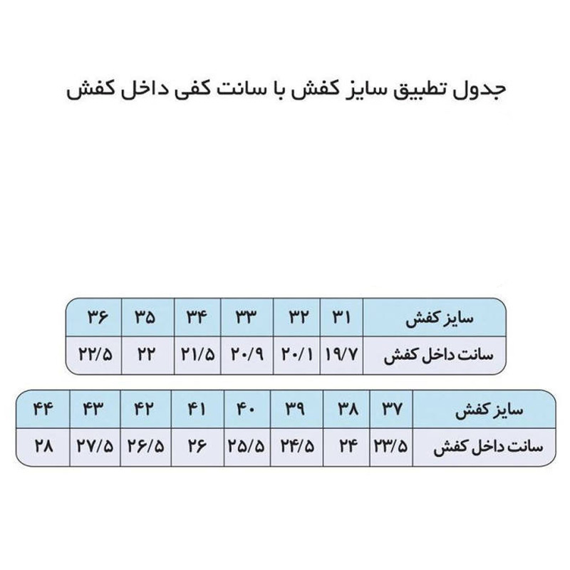 زیره این کفش از جنس پی وی سی بوده و مقاوم در برابر سایش و خستگی پا هست.