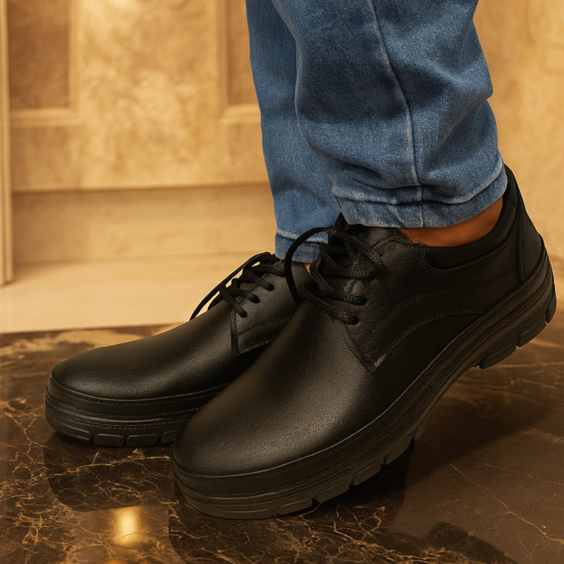 این کفش مردانه با رویهای از جنس چرم مصنوعی تولید شده است که علاوه بر زیبایی ظاهری، مقاومت و دوام بالایی نیز دارد. بافت چرم مصنوعی باعث میشود پا در هنگام استفاده طولانیمدت احساس راحتی بیشتری داشته باشد. زیره این کفش از پلیمر مرغوب ساخته شده است که در برابر سایش مقاوم بوده و انعطافپذیری مناسبی برای راه رفتن روزانه فراهم میکند. همچنین طراحی دوردوخت کفش، استحکام و ماندگاری آن را دوچندان کرده است.