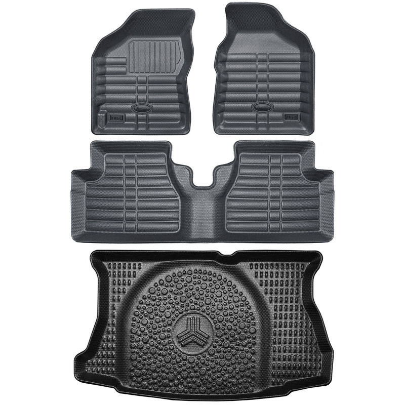 (کفپوش سه بعدی اکونومی ) محصول فوق کفپوش سه بعدی اتاق به همراه کفپوش صندوق مناسب برای انواع کوییک میباشد و رنگ بندی درج شده در ان مربوط به کفپوش اتاق میباشد و کفپوش صندوق تنها به صورت رنگ مشکی میباشد. در این کفپوش ها از مواد اولیه درجه یک پلی اتیلن برای رویه و نمد برای پشت کار استفاده شده است طراحی این کفپوش به شکلی بوده که به آن ظاهری سهبعدی بخشیده است. کفپوش فوق دارای سه تکهی مجزا بوده که دو تکه برای قسمت جلوی خودرو بوده و قسمت یکتکهی بزرگ برای قرارگرفتن در بخش عقبی خودرو طراحی شده است. این کفپوش بهخوبی کف خودرو را پوشش میدهد و مانع از خوردگی و ساییدگی آن میشود. این محصول به دلیل طراحی مناسبی که دارد، بهراحتی نمیلغزد و بهخوبی در جای خود قرار میگیرد. لطفا کفپوش های فابریک خودرو را خارج کنید تا برای کفپوش سه بعدی مزاحمت ایجاد نشود/