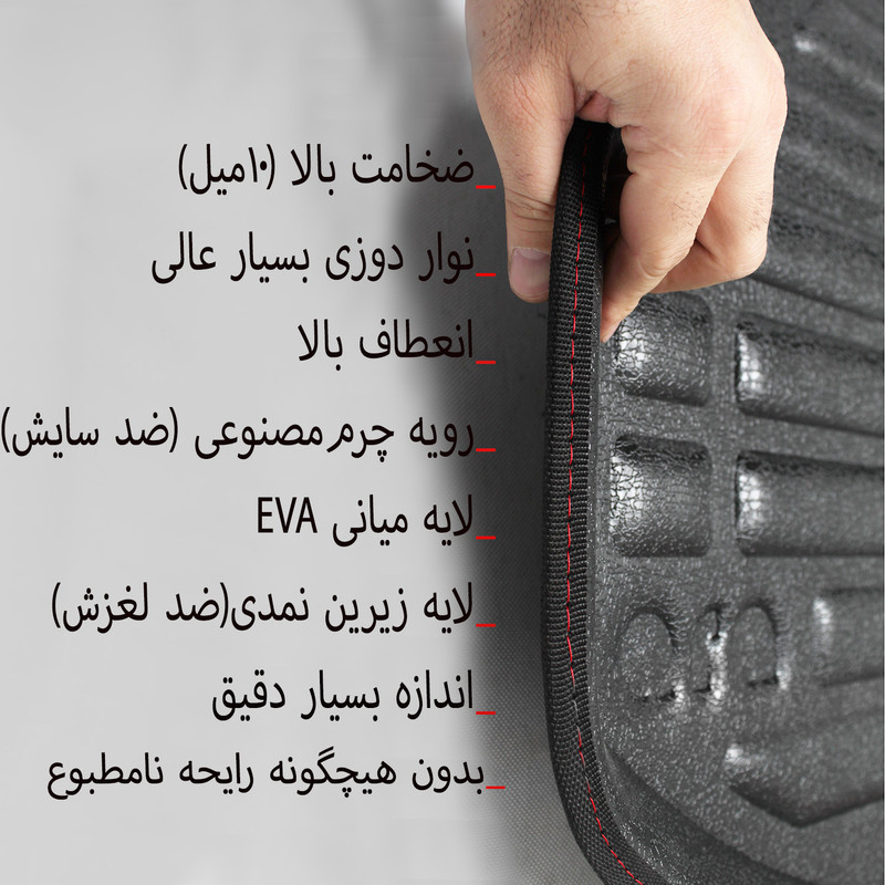 محصول فوق در کارخانجات اطلس رنگین آرا تولید می شود این مدل کفپوش ها از سه لایه تشکیل مشوند: جنس رویه آن چرم مصنوعی است که ظاهر بسیار زیبایی دارد و همخوانی زیادی با کابین خودرو دارد ،جنس میانی از مواد چند لایه نانو EVA که بسیار نرم و انعطاف پذیر است و جنس زیری آن حالت نمدی دارد تا از لغزش آن در کف صندوق جلو گیری و باعث استحکام ان شود. دور کفپوش با ظرافت و دقت بالایی نوار دوزی شده است ، کاملا ضد آب است و قابلیت شست و شو دارد دارای لبه پنج سانتی متری می باشد که به طور کامل از ریختن و نفوذ مایعات به کف خودروی شما جلو گیری می کند _ وجه تمایز این مدل نسبت به سایر کفپوشها استفاده از مواد چند لایه نانو EVA و نرمی و ضخامت بالای ان میباشد تا از سُر خوردن اجسام روی آن جلو گیری شود.