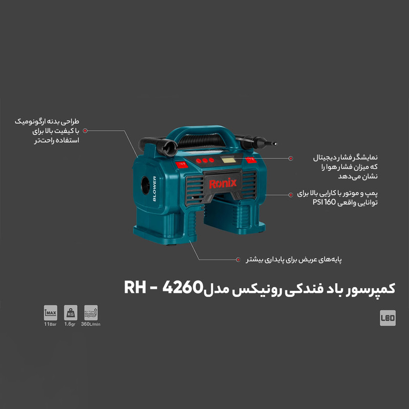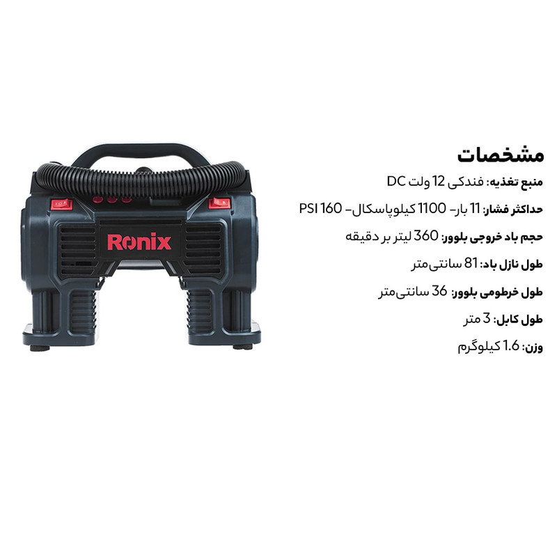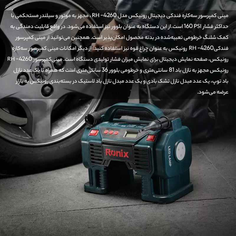 از کاربردهای کمپرسور هوا در خودرو میتوان به تمیزکاری و گردگیری محیط درون خودرو اشاره کرد. کمپرسور باد فندکی «Ronix» «رونیکس» با مدل (RH-4260) در بازار موجود است. وزن این کمپرسور 1500 گرم بوده و برای استفاده در انواع خودرو مناسب است. دبی دمنده این دستگاه 400 لیتر بر دقیقه است و ولتاژ ورودی آن 12 ولت از طریق فندکی خودرو است. این محصول قادر به تولید فشار 160 PSI را از دو خروجی هوا دارد. دبی هوای این محصول 16 لیتر بر دقیقه و مجهز به فشارسنج، دستگیره، شلنگ 80 سانتیمتری و خرطومی 48 سانتیمتری است. کمپرسور باد رونیکس قابلیت نمایش فشار هوا به واحدهای بار، پی اس آی و کیلو پاسکال را دارد؛ همچنین این دستگاه دارای نمایشگر دیجیتال، قابلیت تنظیم فشار باد خروجی از دستگاه و 3 عدد لامپ LED جهت استفاده از دستگاه بهعنوان چراغ قوه است. کابل فندکی این کمپرسور 3 مترو دارای پایهای با قابلیت جذب لرزش است.