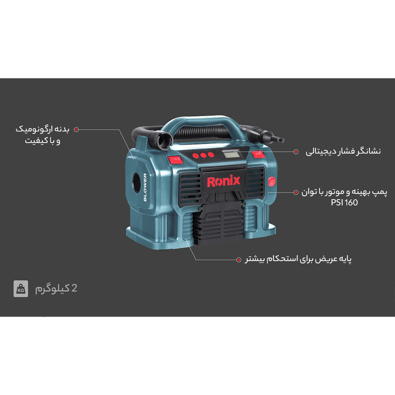 استفاده از کمپرسور باد در خودرو میتواند مزایای زیادی را از جمله گردگیری و تمیزکاری محیط داخل خودرو داشته باشد. کمپرسور باد فندکی «Ronix» «رونیکس» با مدل (RH-4261) در بازار موجود است. وزن این کمپرسور 2100 گرم بوده و برای استفاده در خودرو و همچنین مصارف خانگی مناسب است. ولتاژ ورودی آن 220 ولت برق شهر و 12 ولت فندکی خودرو است. این محصول قادر به تولید فشار 160 PSI را از دو خروجی هوا دارد. دبی هوای این محصول 15 لیتر بر دقیقه و مجهز به فشارسنج، دستگیره، شلنگ 80 سانتیمتری و خرطومی 48 سانتیمتری است. کمپرسور باد رونیکس قابلیت نمایش فشار هوا به واحدهای بار، پی اس آی و کیلو پاسکال را دارد؛ همچنین این دستگاه دارای نمایشگر دیجیتال، 3 عدد نازل جهت اتصال به تجهیزات مختلف و 3 عدد لامپ LED جهت استفاده از دستگاه بهعنوان چراغ قوه است. کابل برق این محصول 2 متر و کابل فندکی آن 3 متر است. این دستگاه دارای پایهای با قابلیت جذب لرزش است.