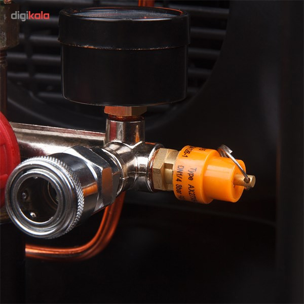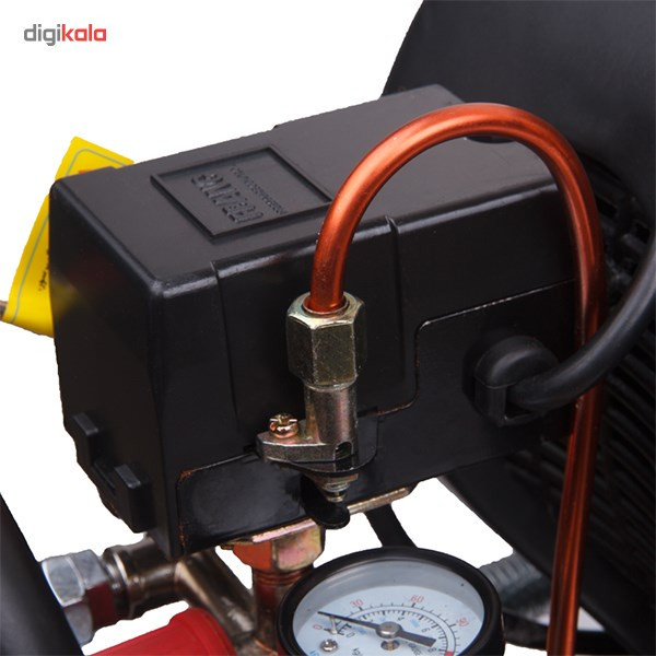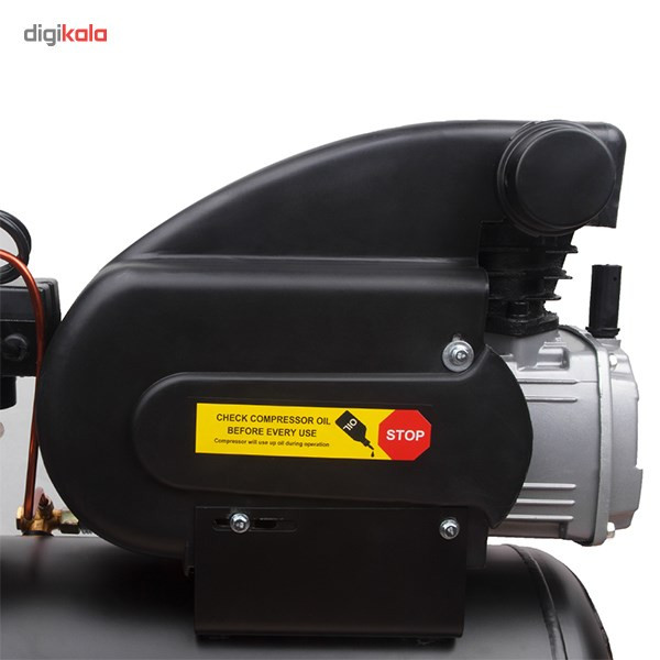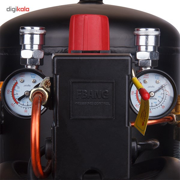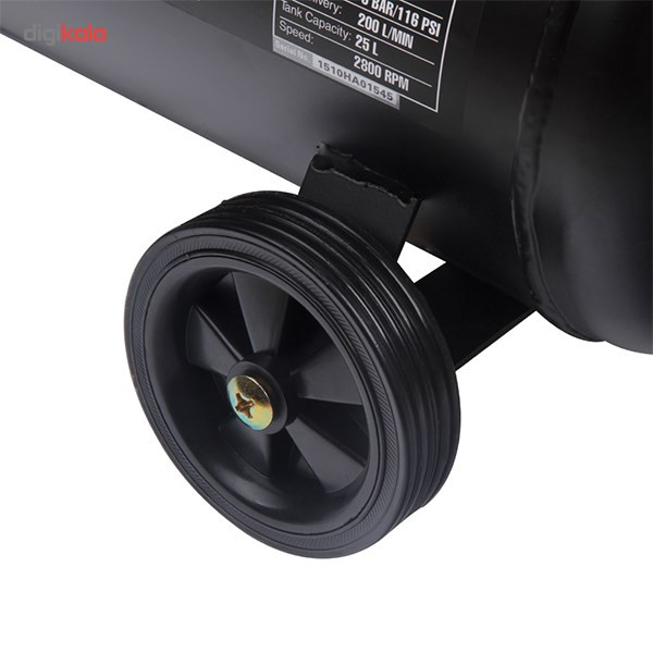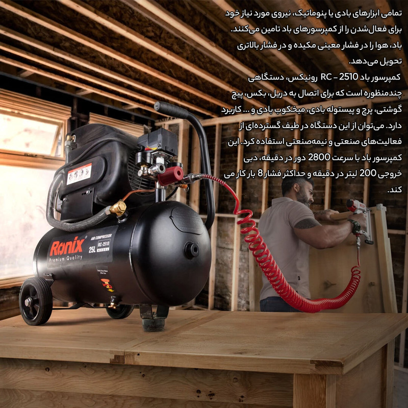 کمپرسورها نیز مانند پمپها به منظور ایجاد نیرویی مناسب برای حرکت سیالات استفاده میشوند. بیشترین میزان استفاده از کمپرسورهای هوا در صنعت است اما این تجهیزات با قدرتهای کمتر نیز به منظور انجام کارهای نیمه صنعتی مورد استفاده قرار میگیرند. محصولی که در تصویر مشاهده میکنید کمپرسور مدل «RC-2510» است که توسط شرکت «رونیکس» (Ronix) تولید میشود و توانی برابر 1492 وات دارد و برای مصارف صنعتی و غیر صنعتی مناسب است. منبع تغدیهی این کمپرسور برق 220 ولت شهری بوده و قادر است جریانی با حداکثر فشار 116 پی اس آی ایجاد کند. این کمپرسور ظرفیتی برابر 25 لیتر دارد و دبی آن 200 لیتر بر دقیقه است. این محصول دارای فشارسنج بوده و میزان فشار را به خوبی نمایش میدهد. یکی از نقاط قوت کمپرسور در قسمت خروجی آن است و از دو نازل خروجی بهره میگیرد. در این صورت میتوانید دو جریان خروجی هوایی داشته و با کمک شیری که در بالای آن قرار دارد دبی خروجی را کنترل کنید. در صورتی که فشار هوای داخل مخزن بیش از حد شود، سوپاپ اطمینانی وجود دارد که با خروج هوا میزان فشار را سریعا کاهش میدهد. این محصول دارای کلید استارتی با تکنولوژی LEFCO بوده و به صورت چرخشی عمل میکند. این کمپرسور حجمی بالا دارد و برای جابهجایی راحتتر آن میتوانید از چرخ و دستگیرهی تعبیه شده برای آن استفاده کنید. به همراه این کمپرسور یک روغن روانکاری نیز عرضه میشود.