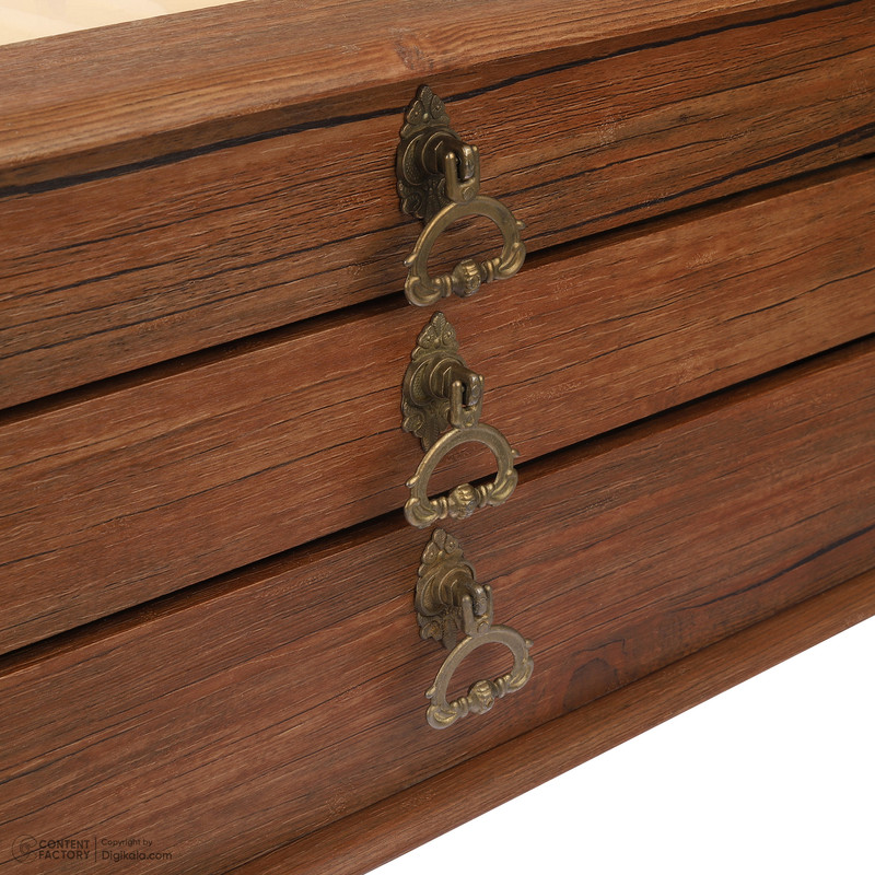 کنسول قاشق چنگال چوبی سه کشو می باشد.که از بهترین نوع روکش با خطوط الهام گرفته از رده های چوب طبیعی طراحی و ساخته شده است. کیفیت ساخت کنسول چوبی تراز اول کیفی را دارا می باشد و جزو لوکس ترین های بازار کشور می باشد. وجه بالایی کنسول از چوب و شیشه ساخته شده که به زیبایی بیش تر این طراحی افزوده است.کنسول مخصوص چیدمان سرویس قاشق و چنگال یکی از زیباترین و منحصرد بفرد ترین کنسول هایی است که میتوانید برای لوازم خانه خود استفاده کنید. کنسول قاشق و چنگال چوبی همراه با فوم ارائه میشود. داشتن فوم در کنسول نکته بسیار قابل ملاحضه است که باید در هنگام خرید به آن توجه شود که برای چیدمان منظم ظروریست.این کنسول برای سرویس های119تا158 پارچه قابل استفاده میباشد.