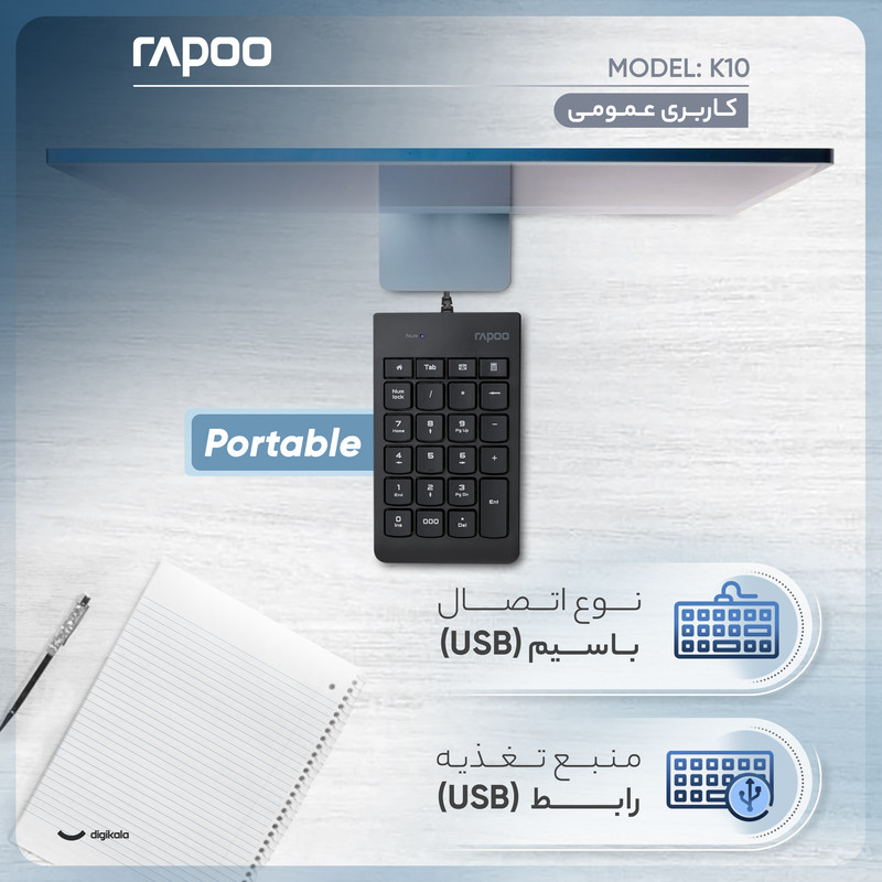 کیبورد اعداد رپو مدل K10، راه حلی جمع‌وجور و کارآمد برای ورود سریع و آسان اطلاعات عددی است. این کیبورد اعداد سیمی و قابل حمل، فضای کمی از میز کار شما را اشغال کرده و به راحتی در کیف لپ‌تاپ جای می‌گیرد. بدنه پلاستیکی سبک و مستحکم، دوام و حمل آسان را تضمین می‌کند. کلیدهای ممبران نرم، تایپ بی‌صدا و لذت‌بخشی را برای محاسبات و ورود داده‌های عددی فراهم می‌سازند. رپو K10 با ۲۳ کلید و چهار کلید میانبر، سرعت و دقت شما را در انجام امور مالی و حسابداری افزایش می‌دهد. اتصال Plug & Play و سازگاری گسترده با سیستم‌عامل‌ها، استفاده از این کیبورد را بسیار ساده می‌سازد. رپو K10، انتخابی هوشمندانه برای کاربرانی است که به دنبال یک کیبورد اعداد قابل اعتماد و با کیفیت برای استفاده در خانه، محل کار یا سفر هستند. این کیبورد، بهره‌وری شما را در کارهای عددی به طور چشمگیری ارتقا می‌دهد.