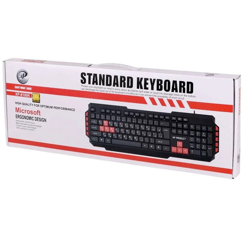روف، اعداد و علامت‌هایی که روی کلیدهای کیبورد XP-8100K حک شده‌اند، کاملا بزرگ و شفاف هستند تا به راحتی قابل خواندن باشند و نیازی به دقت زیاد در هنگام استفاده از آن نباشد.این کیبورد کاملا ساده و کاربردی طراحی شده و به دلیل بهره‌بری از کلیدهای استاندارد و بسیار نرمی که به ندرت صدایی از خود ایجاد می‌کنند، قابلیت یک تایپ بسیار نرم، روان و تقریبا بی‌صدا را برای شما به ارمغان می‌آورد.این کیبورد دارای پایه‌های خم شونده نیز می‌باشد که قابل تنظیم ارتفاع را به شما می‌دهند. این کیبورد از طریق پورت USB به کامپیوتر شما متصل می شود و نیاز به نصب هیچگونه نرم افزاری ندارد . ضد آب بودن نیز یکی دیگر از ویژگی های این کیبورد وجود حفره در پشت خود می باشد که مایعات و آب را از خود عبور می دهد.