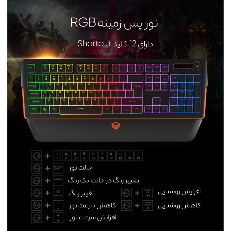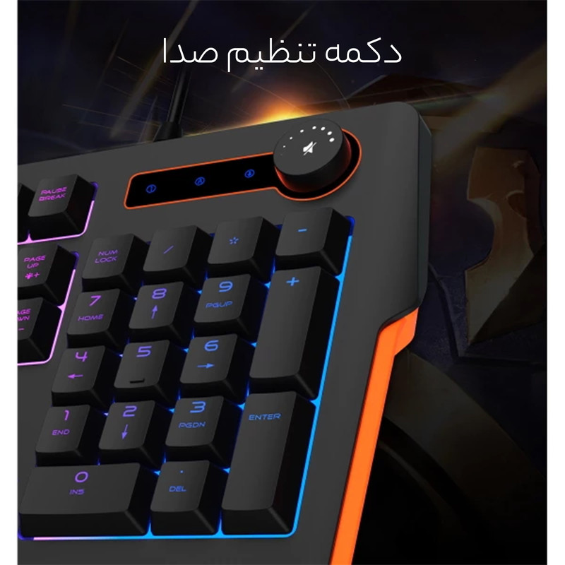 | سایر قابلیتهای صفحه کلید | دارای استراحتگاه مچ مغناطیسی با استحکام بالا دارای 26 کلید Anti-ghosting می باشد که دقت را بسیار بالا می برد کیبورد دارای پیچ تنظیم صدا می باشد دارای نور RGB که داخل دکمه ها می باشد و زیبایی خاصی را به کیبورد می بخشد فاصله دکمه ها استاندارد می باشد و نرم می باشند و می توانید در مدت طولانی به راحتی با آن کار کنید دارای 12 کلید Shortcut سازگاری کامل با Win XP/7/8/10, Vista, MAC OS |