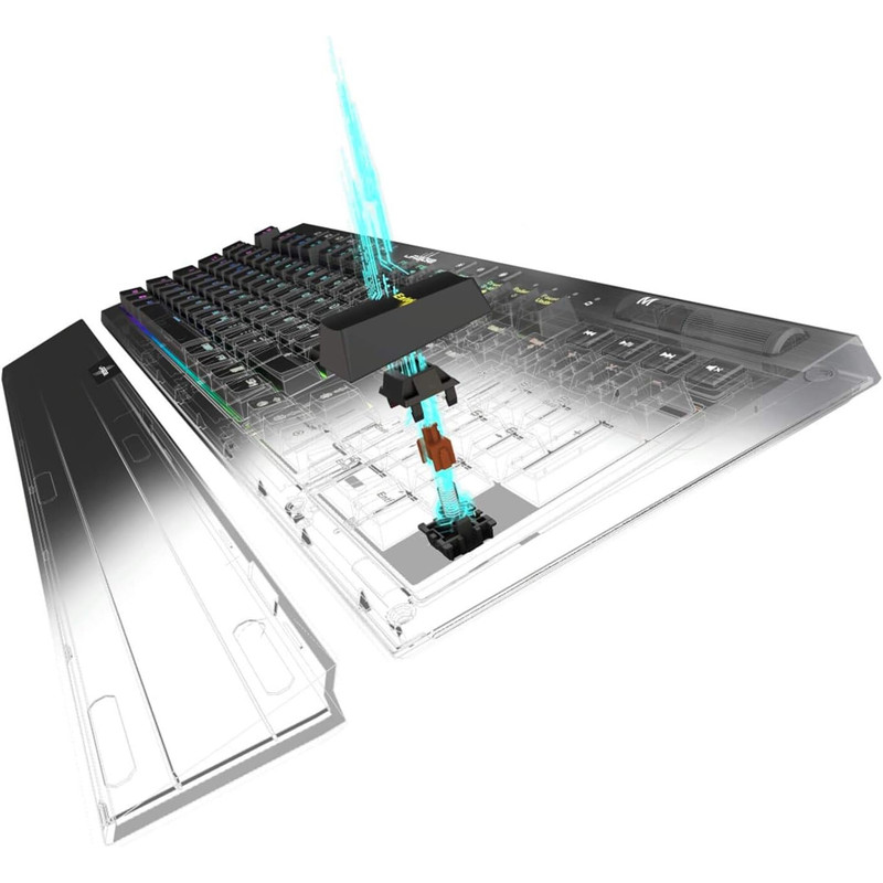 این محصول با استفاده از مدل Outemu Brownدر ساخت کلیدها، حتی در سرعتهای بالا نیز بسیار بیصدا و بادوام عمل میکند. همچنین استفاده از فناوری NKRO که مانع از فشرده شدن کلیدهای اشتباهی و از بین رفتن فرصتهای بازی میشود، حتی زمانی که کاربر، به طور همزمان کلیدهای زیادی را فشار میدهد. به لطف در اختیار داشتن کلیدهای قابل برنامه ریزی و امکان کنترل صدا و شدت نور، هر کاربر قادر به طراحی صفحه کلیدی متفاوت برای خود خواهد بود.
