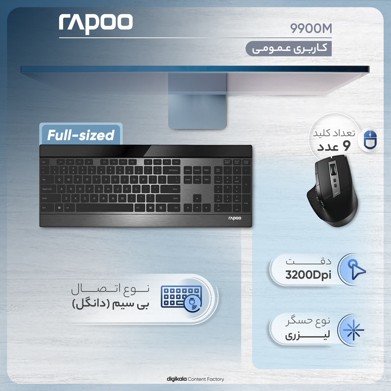 کیبورد و ماوس بیسیم رپو مدل 9900M، یک مجموعه بینظیر برای کاربران عمومی و حرفهای است. این کیبورد با ابعاد 433 × 168 × 23 میلیمتر و وزن 642 گرم، از فرم فاکتور Full Size برخوردار که به معنای داشتن تمامی کلیدهای استاندارد به همراه کلیدهای عددی است. نوع اتصال این کیبورد بیسیم بوده و از طریق دانگل USB و بلوتوث به دستگاههای مختلف متصل میشود. این کیبورد با سوئیچهای ممبران، عملکردی نرم و بیصدا ارائه میدهد. عدم وجود نورپردازی صفحهکلید، آن را برای محیطهای اداری و استفاده روزمره مناسبتر کرده و پایههای ضدلغزش ثبات بیشتری را روی میز کار فراهم میکنند. همچنین، 12 کلید میانبر دسترسی سریع به امکانات مختلف سیستم را ممکن میسازد. کیبورد با تمامی سیستمعاملها سازگار بوده و از طریق باطری تغذیه میشود.
