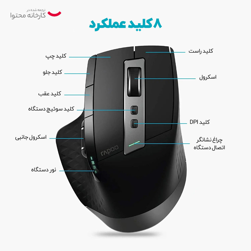 ماوس همراه این مجموعه، با وزن 117 گرم و 9 کلید، یک ماوس لیزری بادقت بین 1600 تا 3200 DPI است که عملکرد دقیقی را در اختیار کاربر قرار میدهد. ماوس بیسیم رپو مدل 9900M از باتری لیتیوم - یونی با عمر متوسط تا 30 روز در صورت شارژ کامل بهره میبرد. این ماوس با طراحی ارگونومیک و کلیدهای متعدد، راحتی و کارایی بالایی را برای کاربران به ارمغان میآورد. مجموعه کیبورد و ماوس رپو مدل 9900M، با طراحی مدرن، ویژگیهای کاربردی و کیفیت ساخت بالا، انتخابی مناسب برای کاربران عمومی و حرفهای است که به دنبال یک مجموعه کامل و کارآمد برای کارهای روزمره و حرفهای خود هستند.