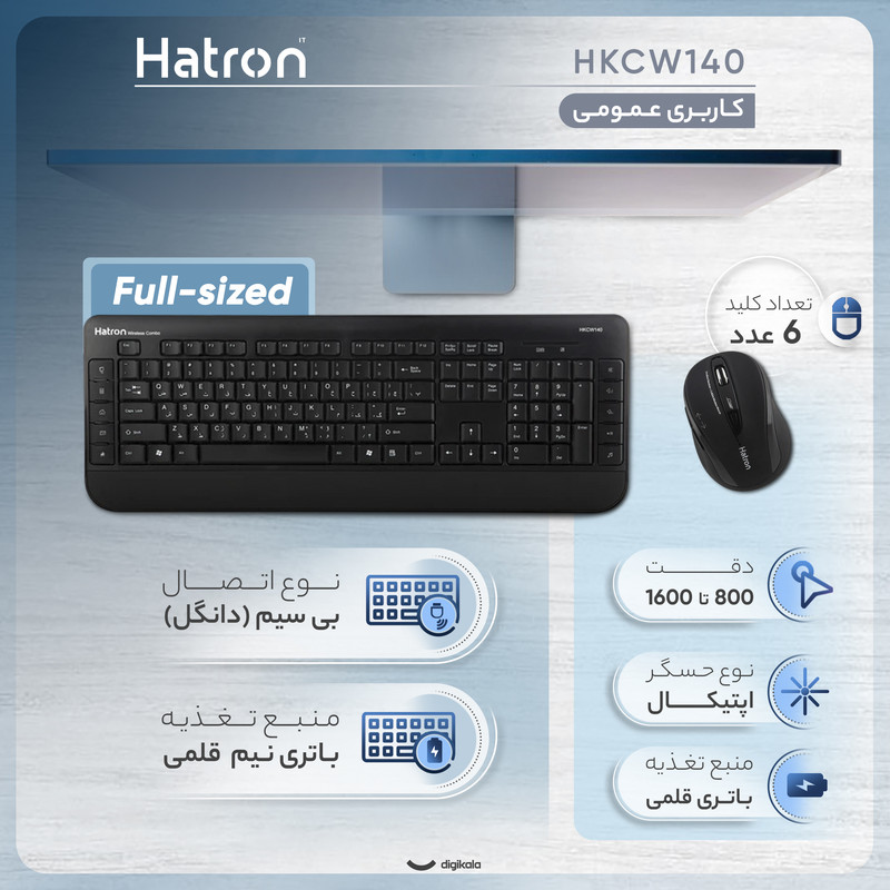 کیبورد و ماوس بیسیم هترون مدل HKCW140 یک ست کامل و کاربردی برای افرادی است که به دنبال یک تجربه تایپ بیصدا و کنترل دقیق ماوس هستند. این مجموعه با طراحی ارگونومیک، بدنه مقاوم و قابلیت اتصال بیسیم، یکی از گزینههای ایدهآل برای استفاده در محیطهای اداری و خانگی به شمار میآید. کیبورد این مدل دارای ۱۱۴ کلید با چیدمان Full-Size است که از کلیدهای عددی جداگانه بهره میبرد و مناسب برای تایپ سریع و دقیق است. همچنین وجود ۱۰ کلید میانبر اختصاصی بر روی این کیبورد برای کنترل عملکردهای پرکاربرد مانند تنظیم صدا، ایمیل و وبگردی، باعث افزایش بهرهوری کاربر میشود. اتصال بیسیم این ست از طریق دانگل USB و فرکانس ۲.۴ گیگاهرتز، ارتباطی پایدار و کاملا بدون تأخیر را فراهم میکند. ماوس این مجموعه نیز دارای طراحی ارگونومیک و ۶ کلید کاربردی است که عملکردی سریع و روان را با حسگر اپتیکال ۱۶۰۰ DPI ارائه میدهد. دقت متغیر این ماوس، امکان تنظیم سرعت را متناسب با نیاز کاربران فراهم کرده و قابلیت Auto Power باعث صرفهجویی در مصرف باتری میشود. بهطور کلی، این مجموعه برای افرادی که به دنبال یک ست کامل، مقاوم، کممصرف و خوشدست هستند، گزینهای اقتصادی و کارآمد برای انواع کاربریهای مختلف محسوب میشود.