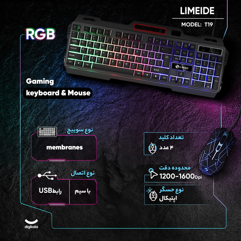کیبورد و ماوس گیمینگ لایماید مدل T19، سوییچ ممبران، Full-Size، نورپردازی LED RGB