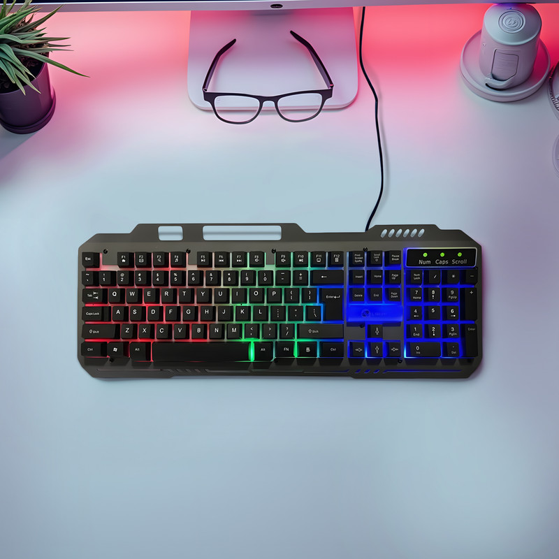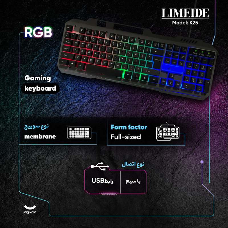 کیبورد گیمینگ سیمی لایماید مدل K25، یک صفحهکلید مخصوص بازی است که با هدف ارائه تجربه بصری جذاب و عملکرد قابل قبول در بازیها و کاربریهای روزمره طراحی شده است. این کیبورد با نورپردازی پس زمینه RGB LED، جلوههای رنگی متنوع و چشمنوازی را به میز کار شما میبخشد و حس و حال گیمینگ را تقویت میکند. بدنه پلاستیکی این محصول با وزن ۷۱۲ گرم، استحکام مناسب و پایداری مطلوبی را ارائه میدهد. کلیدهای ممبران کیبورد K25، تایپ نرم و کمصدا را فراهم میآورند و با عمر ضربهپذیری مناسب، دوام و طول عمر قابل قبولی را تضمین میکنند. اتصال سیمی این کیبورد از طریق رابط USB، اتصالی پایدار و بدون تاخیر را به سیستم شما برقرار میسازد. کیبورد K25 دارای ۱۰۴ کلید، پایههای قابل تنظیم ارتفاع و پایههای ضد لغزش است که تجربه کاربری راحت و ارگونومیک را به ارمغان میآورد. ۱۲ کلید میانبر در این کیبورد، دسترسی سریع به عملکردهای پرکاربرد سیستمعامل و نرمافزارها را امکانپذیر میسازد. سازگاری با تمامی سیستمعاملها، از دیگر ویژگیهای این کیبورد گیمینگ است. در مجموع، کیبورد گیمینگ سیمی لایماید مدل K25، گزینهای جذاب و کارآمد برای گیمرها و کاربرانی است که به دنبال یک کیبورد با نورپردازی RGB، عملکرد قابل قبول و قیمت مناسب هستند.