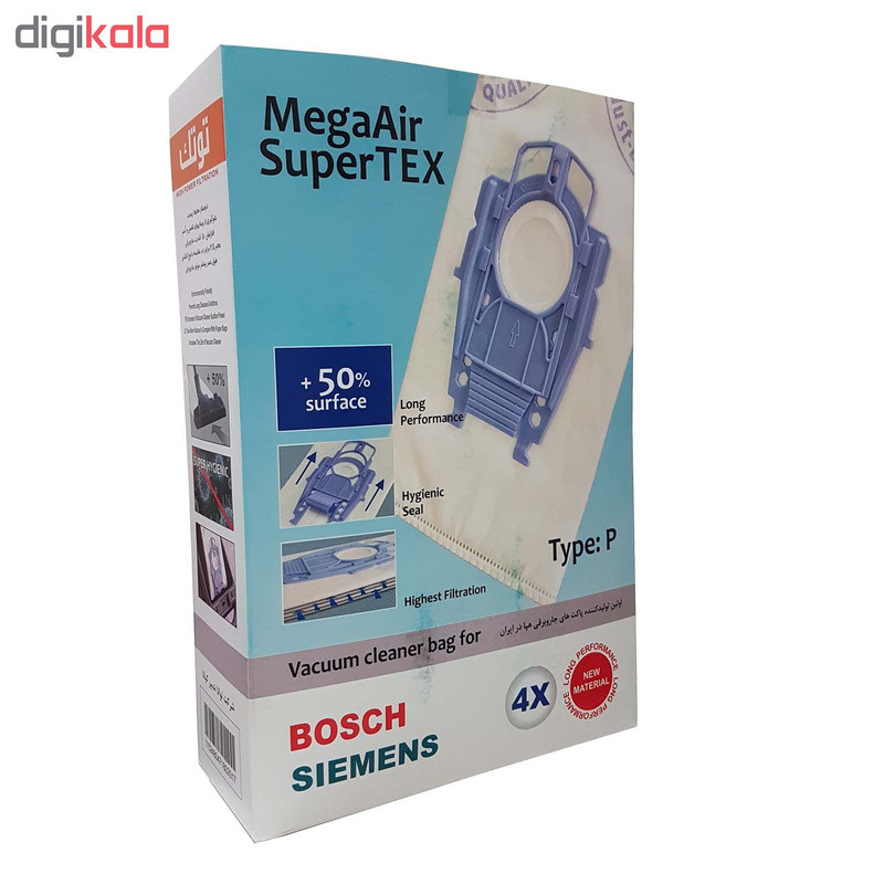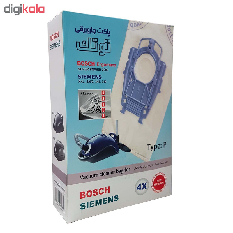 | سایر توضیحات | چهار عدد پاکت پنج لایه هپا عدم افت مکش جاروبرقی صرفه جویی در خرید پاکت تهیه شده از مواد بهداشتی ضد باکتری و دوستدار محیط زیست حداقل نشت خاک و ریزگرد به محیط مناسب جاروبرقی بوش مدل ارگومگس (TYPE P) سوپر پاور مناسب جاروبرقی زیمنس مدلهای XXL,Z/6/0 ,348,349 |