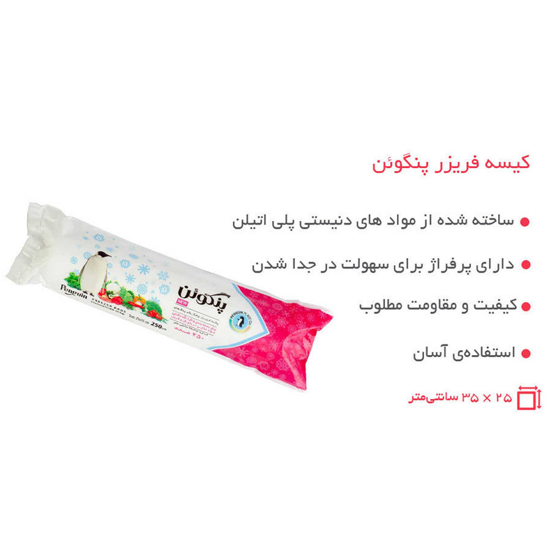 برای جلوگیری از نفوذ بوی برخی مواد غذایی مثل ماهی، مرغ، گوشت و... به تمام محیط یخچال و حفظ تازگی آنها، به کیسه فریزر رولی «Penguin» (پنگوئن) «طرح Pingo2» نیاز دارید که دارای مقاومت خوب و کیفیتی مناسب است. چنین کیسهای که دربرابر سوراخشدن و پارگی از استحکام خوبی برخوردار است، از پخششدن این مواد غذایی داخل یخچال یا فریزر جلوگیری میکند. از ویژگیهای برجستهی این مدل، رولی بودن آن است که میتوانید بهسادگی با یک دست، آن را بکشید و با استفاده از نقاط پرفراژ، با دست دیگر آن را از کیسهی بعدی جدا کنید. بستهبندی «طرح Pingo2» پلاستیکی است و با ابعاد 25 × 35 سانتیمتری، بهراحتی در هر جای آشپزخانه جای میگیرد. این کیسه از مواد کاملا بهداشتی ساخته شده و جنس آن پلیاتیلن است؛ به همین علت مقاومت خوبی دارد. برای تازهماندن و حفظ کیفیت اولیهی مواد غذایی مصرفی خود میتوانید از این کیسهها بهره ببرید. شرکت «پنگوئن پلاست» در زمینهی تولید محصولات پلاستیکی فعالیت دارد و برای این تولیدات از تجهیزات پیشرفته و نوین استفاده میکند. پاکت ساندویچ، سفرهی یکبارمصرف، کیسهزباله و فریزر و... از دیگر محصولات این شرکت هستند.