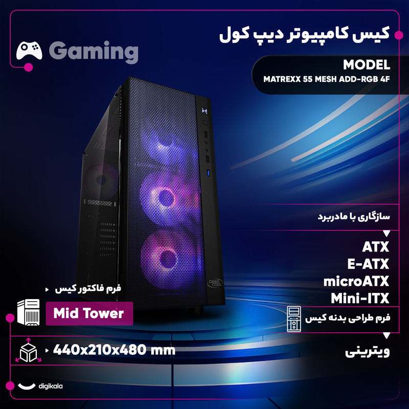 شرکت «دیپ کول» محصولی را با نام MATREXX 55 ADD-RGB 4F روانه بازار کرده است. کیسهای سری MATREXX از ویژگیهایی نظیر سازگاری عالی، طراحی چشمنواز و عملکرد بیعیبونقص خنککننده برخوردار هستند. این کیس با فرم فاکتور Mid Tower است طراحی شده است و با مادربردهای microATX، ATX، Mini-ITX و E-ATX سازگار است. این کیس به همراه 4 فن عرضه شده و در مجموع قابلیت اتصال 6 فن بر روی آن وجود دارد. فیلترهای ضد گردوغبار به همراه سیستم خنک کننده مایع این محصول را از سایر همردههای موجود در بازار تمایز بخشیده است. برای کیس کامپیوتر دیپ کول مدل MATREXX 55 MESH ADD-RGB 4F امکان نصب 4 عدد درایو 2.5 اینچی و 2 عدد درایو 3.5 اینچی در نظر گرفته شده است. این محصول دارای 2 پورت USB2.0 و 1 پورت USB3.0 است تا بهراحتی بتوان اقدام به نصب تجهیزاتی مانند هارد اکسترنال و فلشمموری کرد.