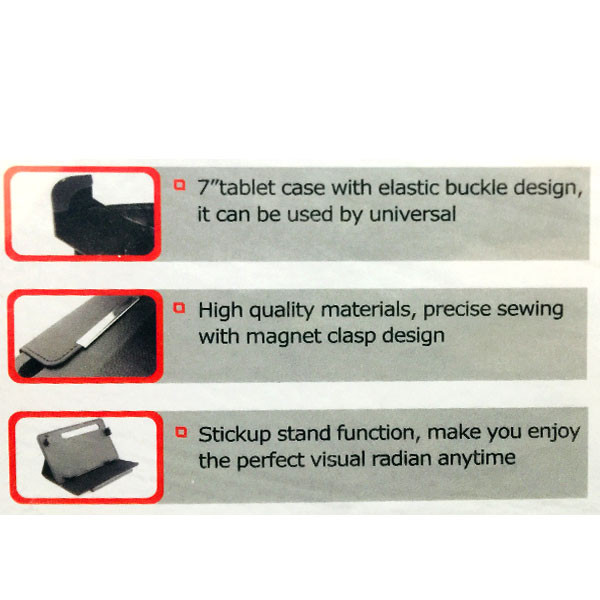 قابلیت ها - دارای روکش چرم مصنوعی - دارای حالت استند برای تایپ کردن و تماشای ویدئو - دسترسی آسان به کلیدها و درگاه‌ها - مناسب تبلت‌های 7 اینچی و آیپد مینی - دارای کش‌هایی برای محکم نگه داشتن تبلت - دارای پوشش داخلی نرم برای محافظت در برابر خط و خش