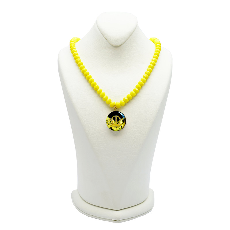 این گردنبند چشم‌نواز با مهره‌های اونیکس زرد طراحی شده که با درخشش گرم و پرانرژی خود، حس نشاط و جذابیت را به استایل شما می‌افزاید. پلاک گردنبند با نماد تاج از جنس روکش طلا ساخته شده و با لایه‌ای شفاف از رزین پوشانده شده تا هم جلوه‌ای براق و یکدست داشته باشد و هم در برابر خط و خش و تغییر رنگ مقاوم بماند. تمام اجزای فلزی گردنبند کاملاً ضدحساسیت هستند و در تماس با پوست، ایجاد حساسیت یا تغییر رنگ نخواهند کرد. این گردنبند انتخابی شیک و باکیفیت برای استفاده روزمره یا هدیه‌ای خاص برای عزیزان شماست.