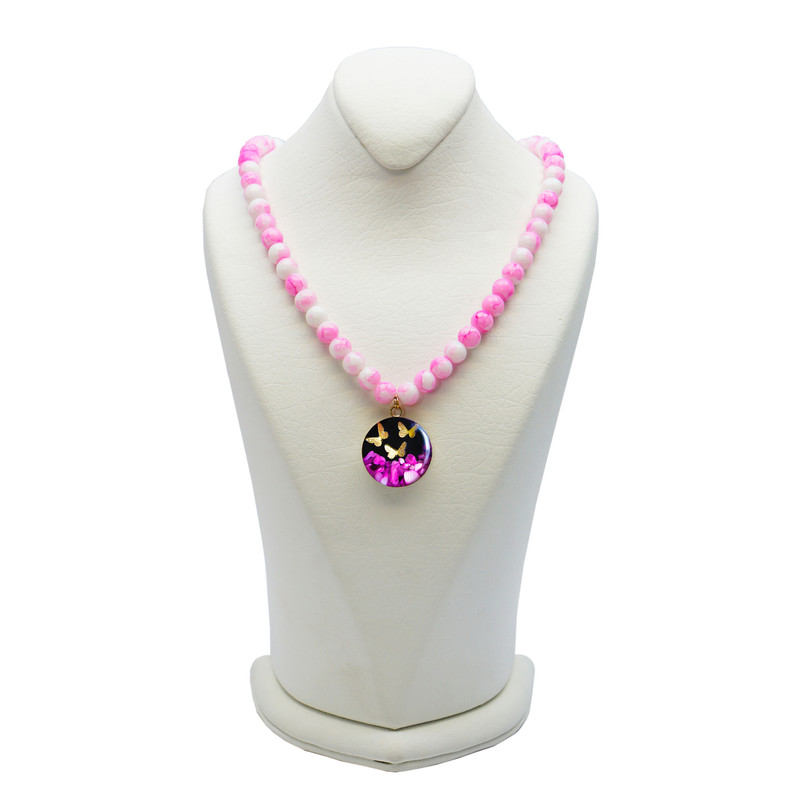 این گردنبند دستساز، ترکیبی چشمنواز از سنگهای صورتی انیکس و هنر ظریف جواهرسازی است. مهرههای گردنبند از سنگهای صورتی انیکس با طیف رنگی ملایم و انرژیبخش ساخته شدهاند که حس لطافت و آرامش را القا میکنند. در مرکز، آویزی گرد قرار دارد که درون آن پروانههایی ظریف از ورق طلا به ضخامت 5 میکرون دیده میشود؛ نمادی از زیبایی، تحول و آزادی. زمینهی آویز با سنگهای خرد شدهی صورتی انیکس تزئین شده که با درخشش خاص خود، هماهنگی بینظیری با مهرههای گردنبند ایجاد کردهاند. تمام سطح آویز با لایهای شفاف از رزین پوشانده شده تا ضمن محافظت از طرح، جلوهای براق و شیشهای به آن ببخشد. این گردنبند میتواند انتخابی عالی برای استفاده روزمره یا تکمیل استایل رسمی و مهمانیهای خاص باشد.