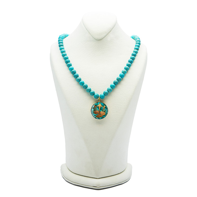 فیروزه(پیروزه) سنگ گران‌قیمت، خوش رنگ و سرشار از خواص درمانی که بیشتر در معادن نیشابور کشف و بهره برداری می شود. زیبایی و خواص درمانی این سنگ ایرانی با ظرافت تمام در کنار سمبل ماه تولد قطعاً بهترین انتخاب برای هدیه را رقم می‌زند. سمبل ماه مهر ترازو است. محصولات دستساز آلتین هنر، حس و انرژی بی نظیر هنر ایرانی را در گردنبند فیروزه ماه مهر خلاصه کرده است. درخشش ورق طلای طرح ترازو در وسط گردنبند سنگ خ...