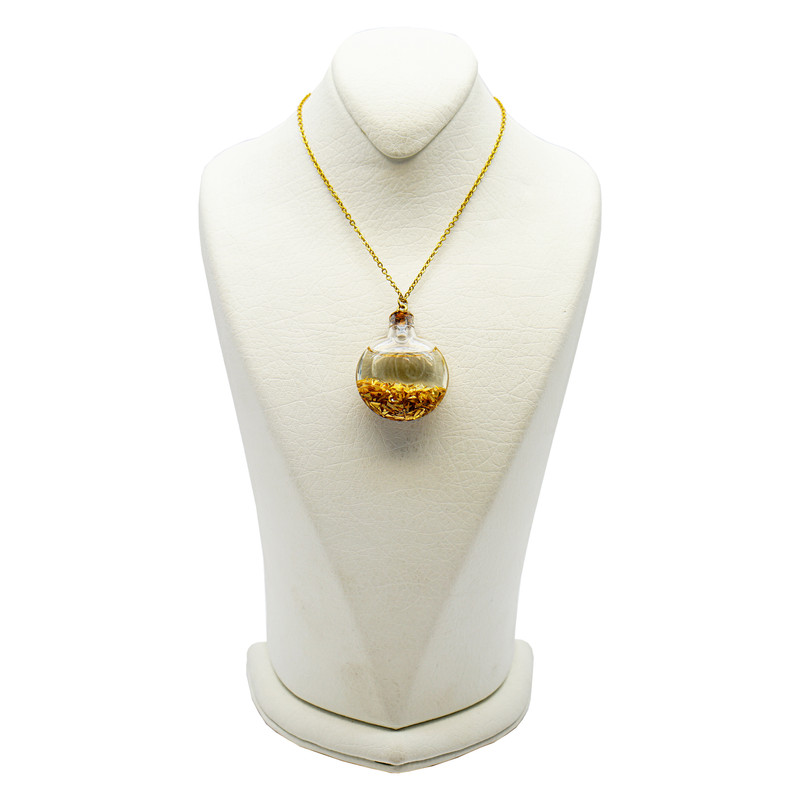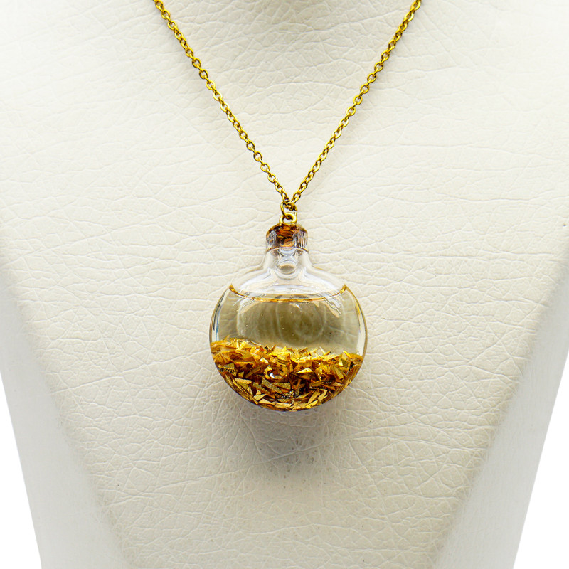 گردنبند گوی شیشهای با طراحی ساده و ظریف، جلوهای خاص و منحصربهفرد به استایل شما میبخشد. آویز این گردنبند به شکل یک گوی شیشهای شفاف ساخته شده است که ترکیبی از برادههای طلایی درخشان و آب داخل آن قرار گرفتهاند. این ترکیب با حرکت طبیعی داخل گوی، حس زنده بودن و پویایی را تداعی میکند و هنگام انعکاس نور، جلوهای جذاب و چشمگیر ایجاد میکند.