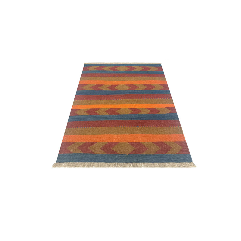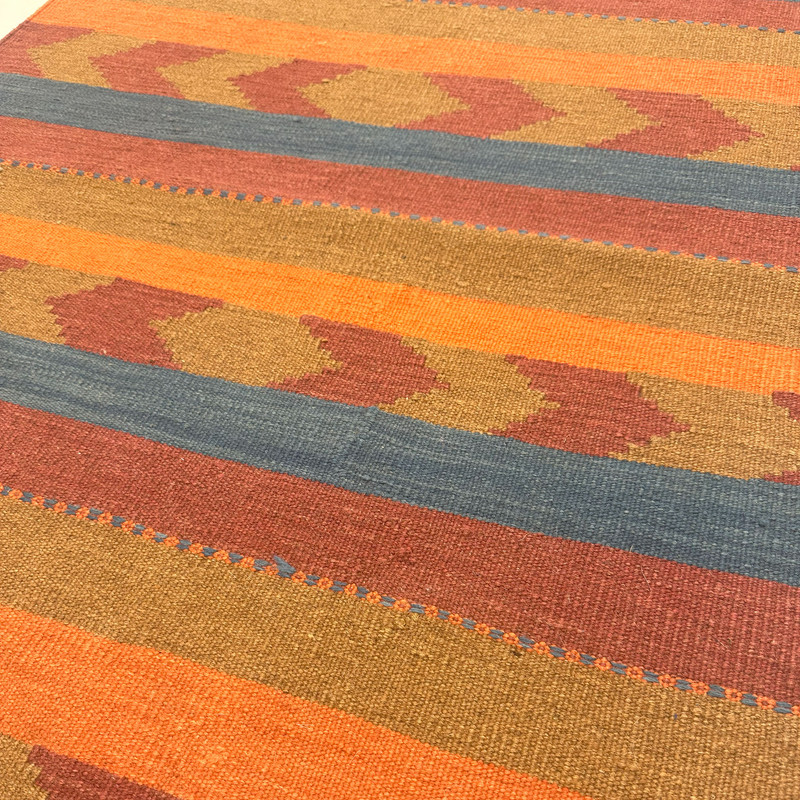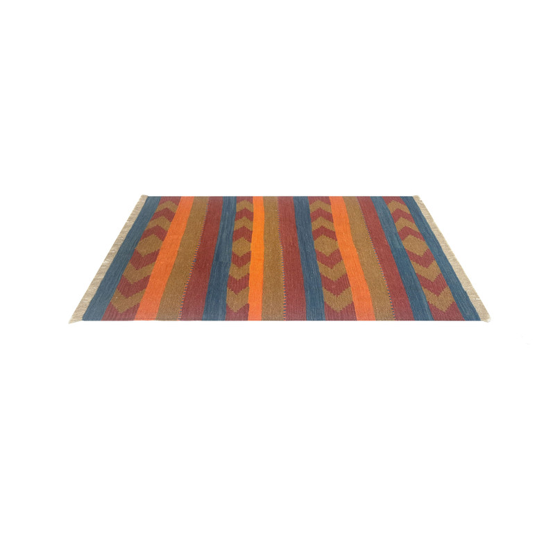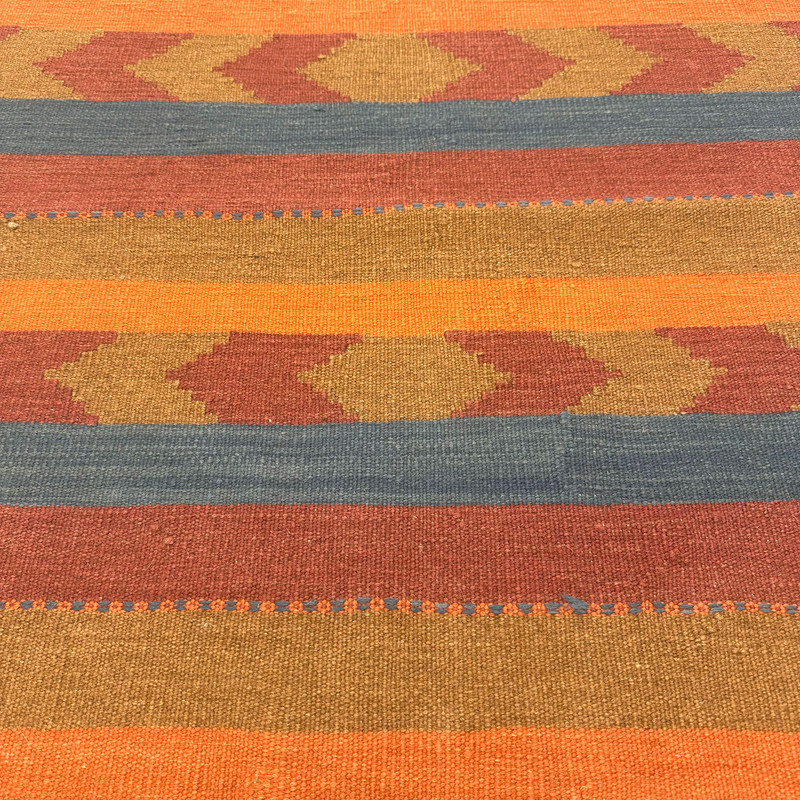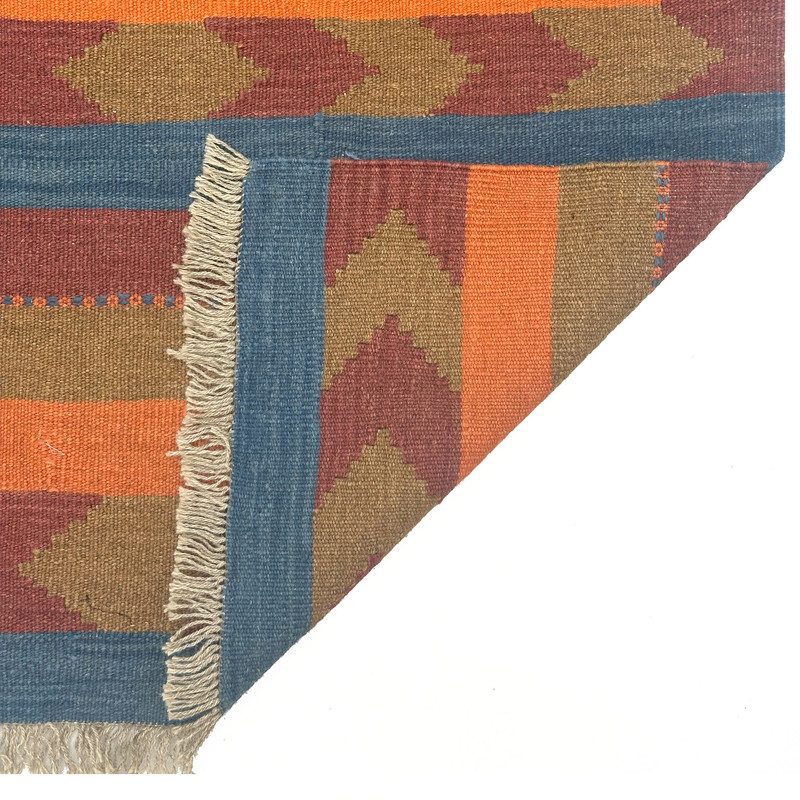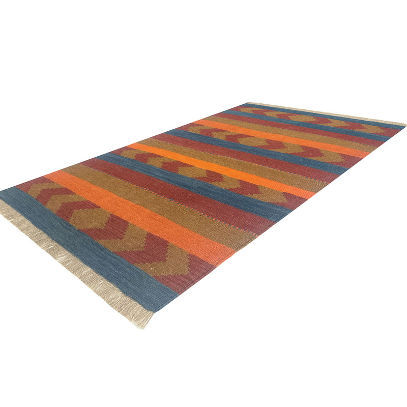 گلیم دستبافت سنتی طرح مدرن محصول بافندگان هنرمند استان فارس میباشد . بند این گلیم از پشم طبیعی است و رنگرزی پشم آن طبیعی و سنتی میباشد هارمونی رنگ آن ترکیب نخ خودرنگ و سنتی ابرش دار و بافت آن به صورت دو رو میباشد .این گلیم شسته شده و دو گره خورده است .سوغاتی ارزنده از استان فارس و ایران زینت بخش منزل و دکورهای سنتی شما است .