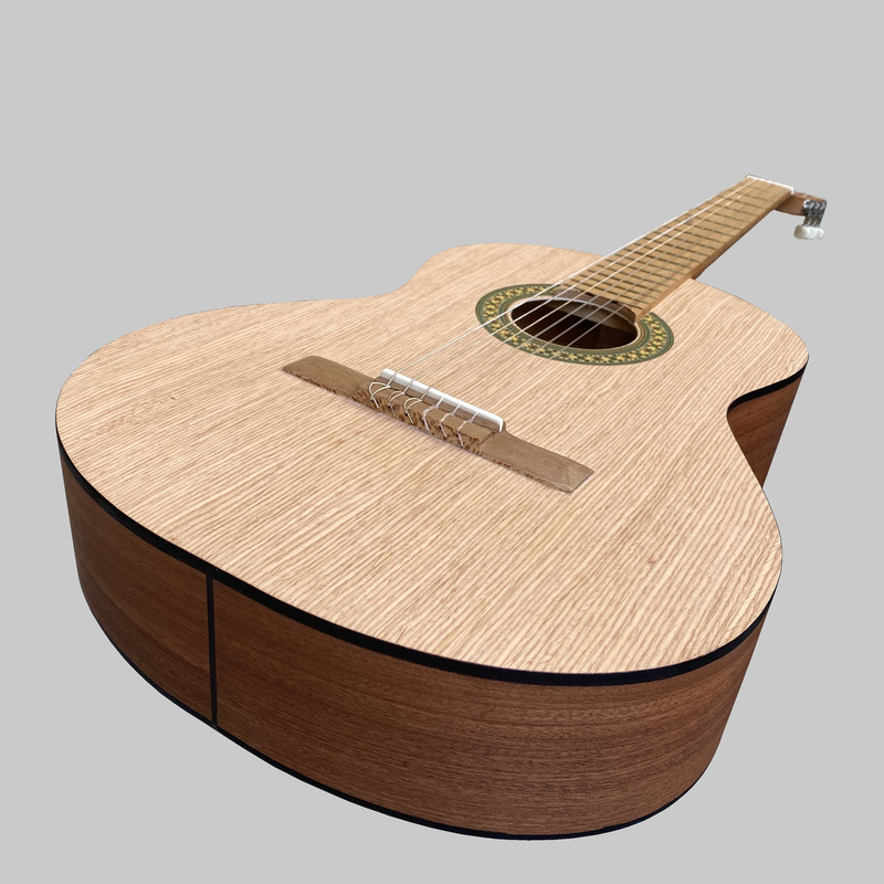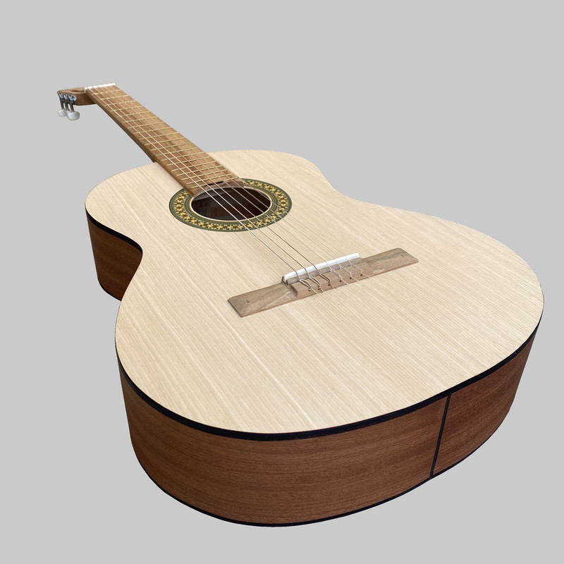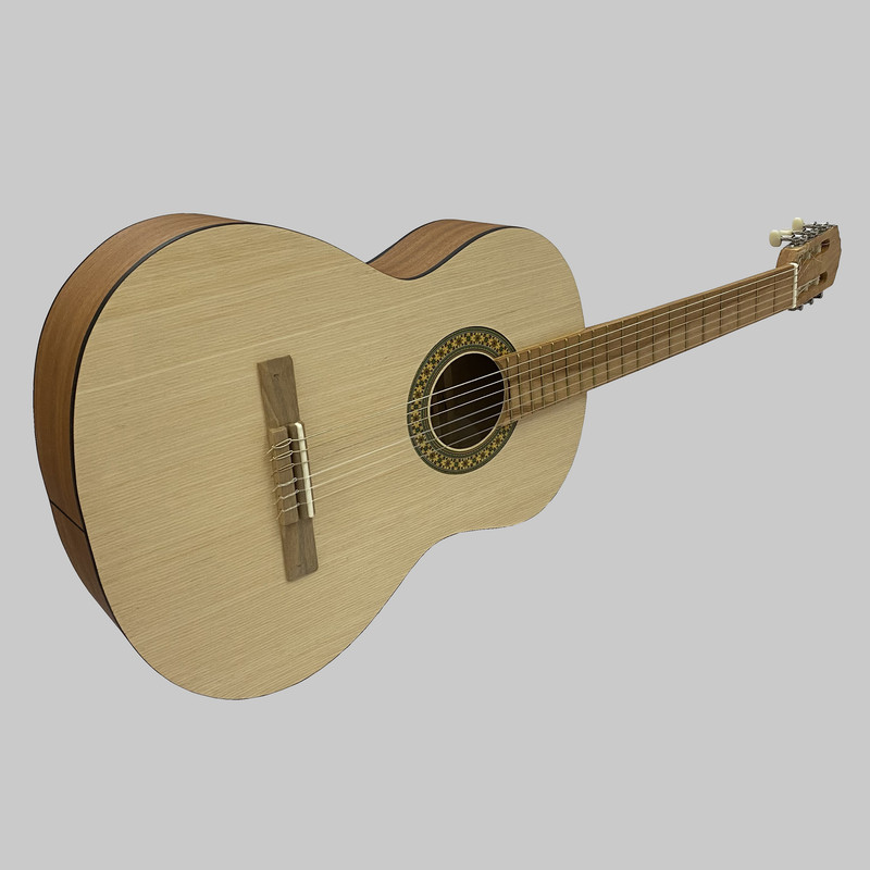 این گیتار میتواند انتخاب درستی باشد برای هر کسی که علاقه مند به این ساز زیباست،و قصد دارد نواختن آن را فرابگیرد.رنگ این ساز مات،و تماماً خود رنگ است،به این منظورکه رنگ و نقشی که میبینید،با رنگ آمیزی ایجاد نشده،و همگی ظاهر زیبای چوب های استفاده شده در این ساز است.سایز کامل استاندارد یا 4/4،آن را برای بزرگسالان،و نوجوانان 9 سال به بالا مناسب میسازد.صفحه پشت و کناره ها از جنس چوب ساپلی است،که چوبی با ارزش از جنگل های آفریقا میباشد،و عملاً بهترین چوب برای بک و ساید گیتار است.صفحهی رویی از جنس چوب اسپیروس است،که مرغوب ترین چوب برای ساخت صفحه ی رو به شمار می آید،و صدایی حرفه ای ایجاد میکند.چوب اسپیروس در صفحه رو،باعث ایجاد صدایی گرم،صدا دهی شفاف و درخشان،و پرتاب صدای واضح و دلنشین ساز میشود،گویی به عنوان یک صافی صدا عمل میکند،تا صدایی دلنشین و لذت بخش را به گوش نوازنده برساند.
